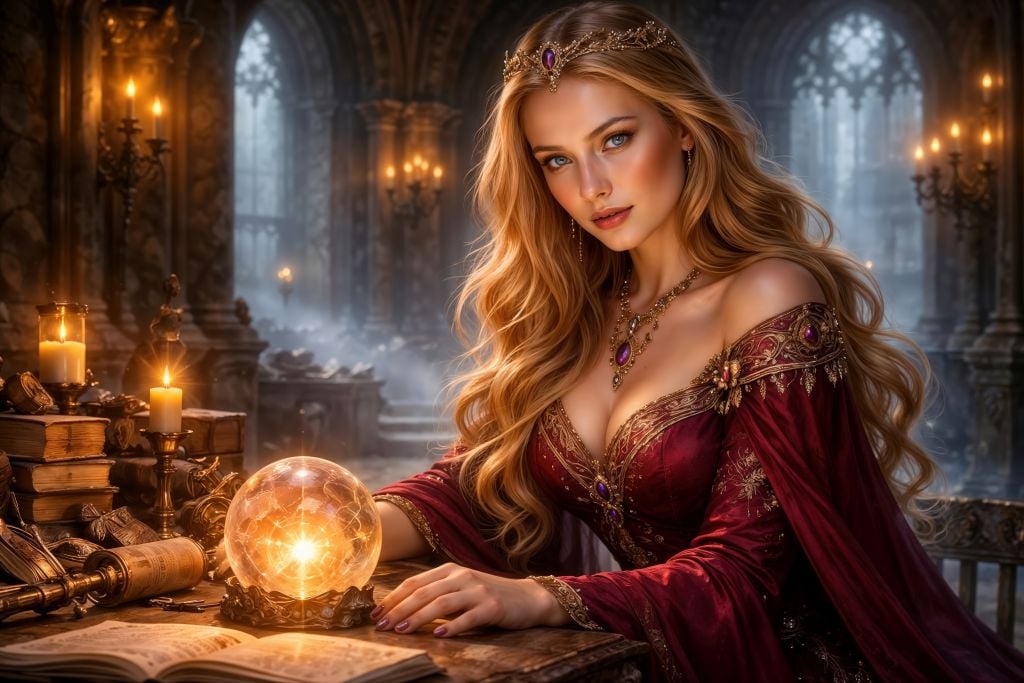 This 10K fantasy artwork captures an enchanting sorceress-queen at her arcane desk, crowned in gold and amethyst, surrounded by ancient tomes and shimmering relics. At the center, a radiant crystal sphere burns like a trapped sunrise—casting warm light across intricate embroidery, jeweled regalia, and that unmistakable “she knows something you don’t” gaze.