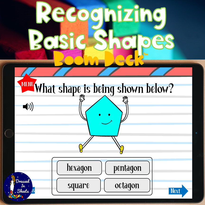 What are these shapes and what are their names? Let's find out! Kiddos will get to see each shape and name them. When they name the shape they will then get to type it so they can memorize the correct spelling. In the other section of the deck the kiddos will get to see shape characters and identify them.