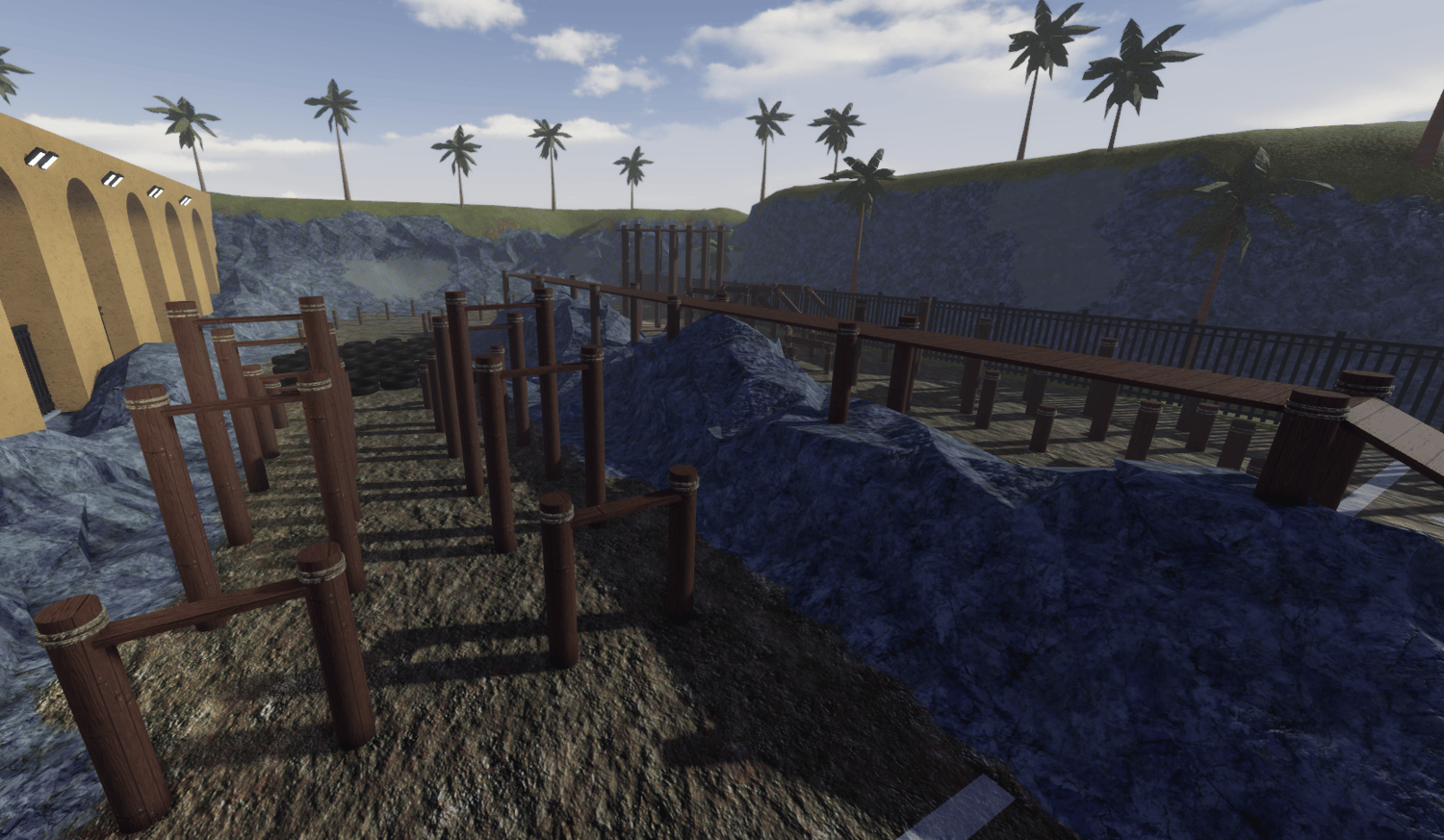 This map combines clean architectural design with strong environmental character: palm-lined courtyards, reinforced gates, refined interiors, drill pads, tracks, challenge courses, a pool building, and advanced lighting setups that create a believable day/night training environment.