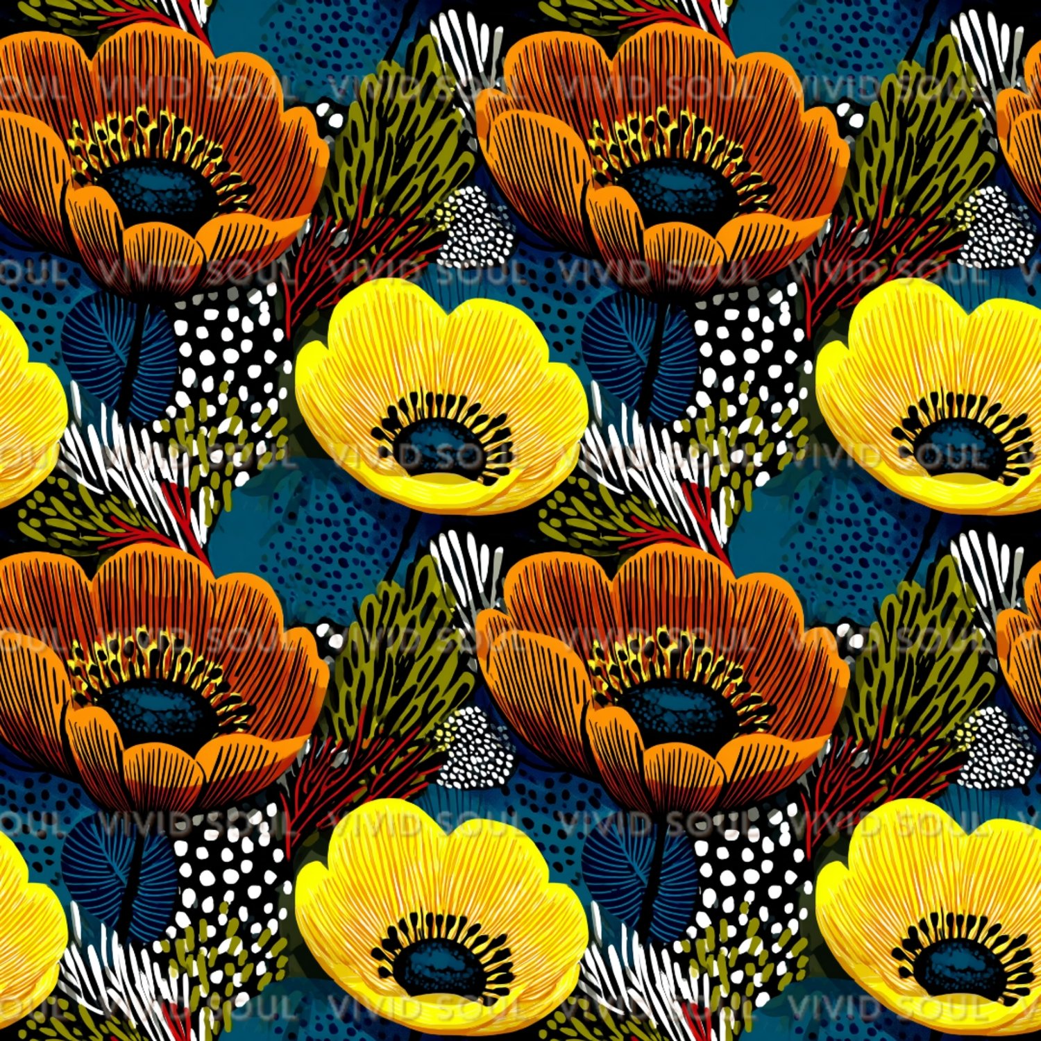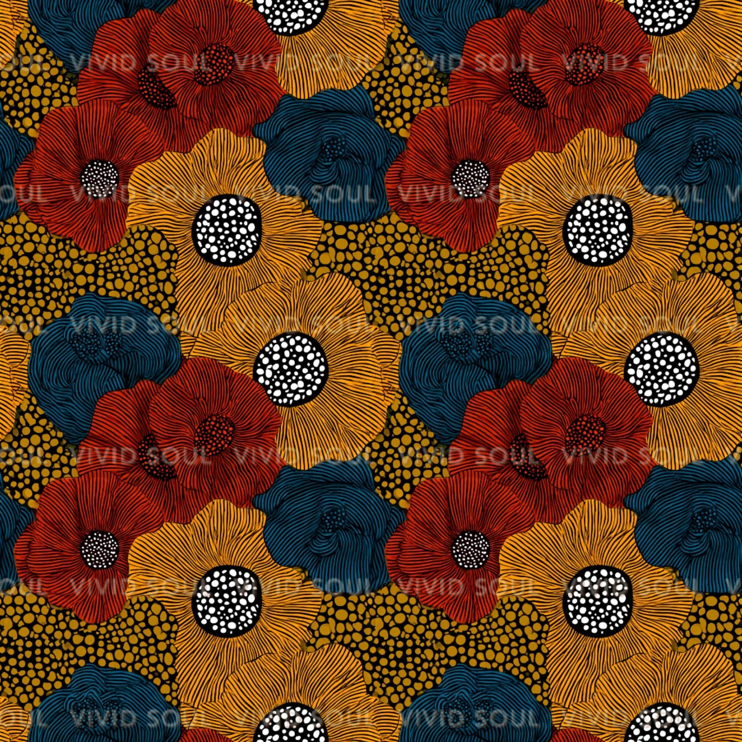 Bold, vibrant, and Afro-inspired — this bundle features 4 seamless floral patterns with retro flair and modern colorways. Perfect for fabric, journals, wall art, packaging, and more. High-resolution (300 DPI) files ready for print or digital projects.