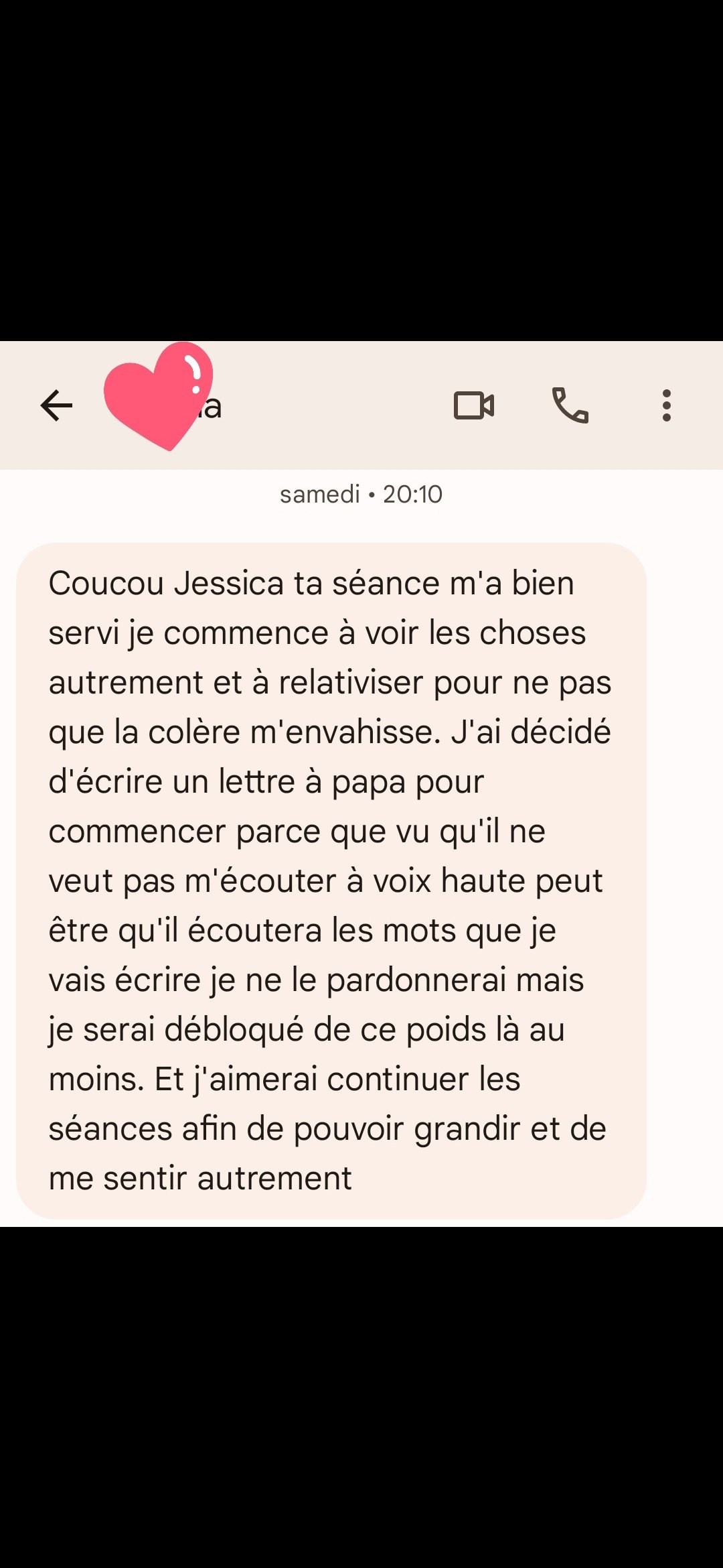 > Durant ce soin, aucune parole n’est nécessaire si tu le souhaites. Tu peux t’allonger, t’endormir, méditer ou simplement te détendre. L’énergie fera ce qu’elle a à faire, c'est moi qui vait te parler. Ton âme sait. Ton corps sait. Je ne suis là que pour accompagner le processus qu’elle initie.