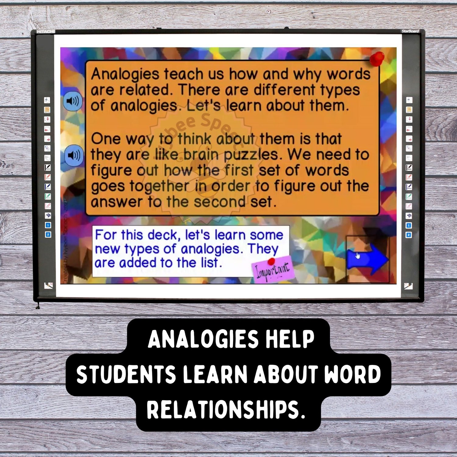 This deck contains explanations and examples of analogies including types of analogies such as antonyms, syonyms, descriptions, categories, sequence/degree, function, and part/whole