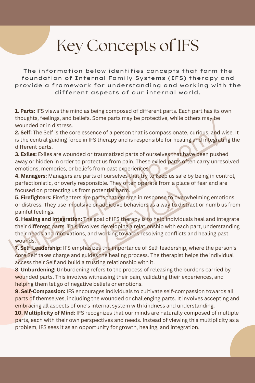 This worksheet identifies some concepts that form the foundation of Internal Family Systems (IFS) therapy. It provides a valuable framework for understanding and working with the different aspects of your internal world.