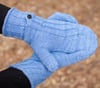 Fiona Ellis has designed this pair of mitts for RCY in her signature style, using rib stitches and slight cable turns to represent hat tricks, hockey rink lines and hockey sticks. A mini pocket holds a lucky loonie, transit ticket or other valuable trinkets. And because the Ancient Arts Hat Trick skeins are so big, you’ll be able to get two pairs of Lucky Mitts from one ball of yarn! Fiona’s mitts are shown (above) in the Hat Trick Vancouver colourway. If you prefer solid colours, you can use one skein of Hat Trick Semi-Solid to make one pair of Lucky Mittens. The solid blue mittens pictured were made using the colour Poke Check.Â