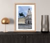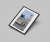 Ilustración minimalista de la Puerta del Sol, con su fachada emblemática y el reloj de la torre. La estatua ecuestre de Carlos III y los adoquines completan la escena, capturando símbolos históricos de Madrid.
