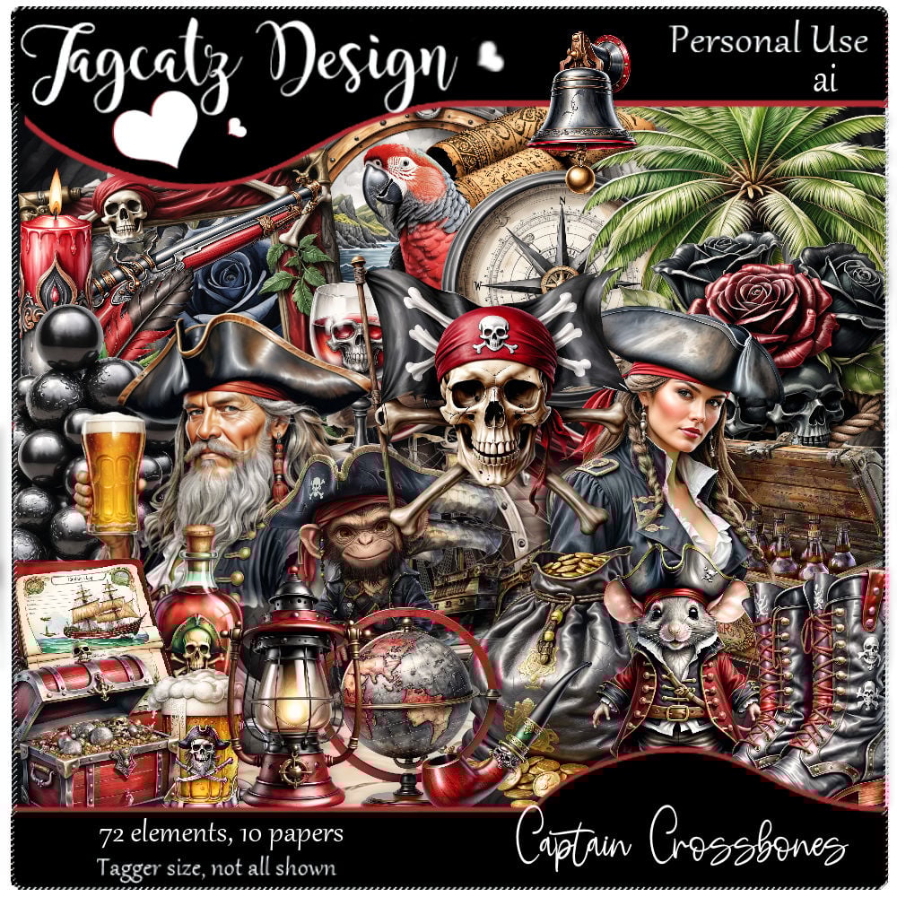 Pirate treasures with Captain Crossbones take you on a voyage on the high seas! 72 elements and 10 matching papers. AI product. Tagger size. Not all shown. Personal use only.
