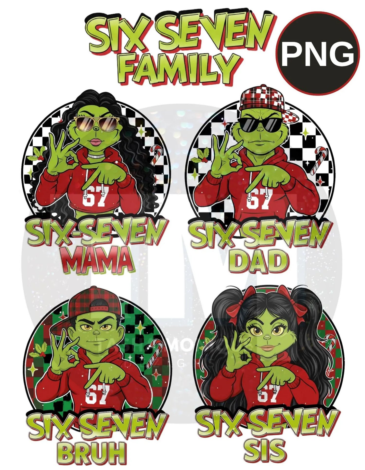 Six Seven Family Custom PNG Set: A vibrant collection of four digital airbrush cartoon illustrations featuring the entire family (Mom, Dad, Sis, Bruh). Each character, with their distinct style—including black and white checkerboard backgrounds, bold red hoodies, and unique accessories like designer shades and pigtails—is ready for holiday or everyday merchandise. This set is perfect for personalized shirts, mugs, and tumblers.