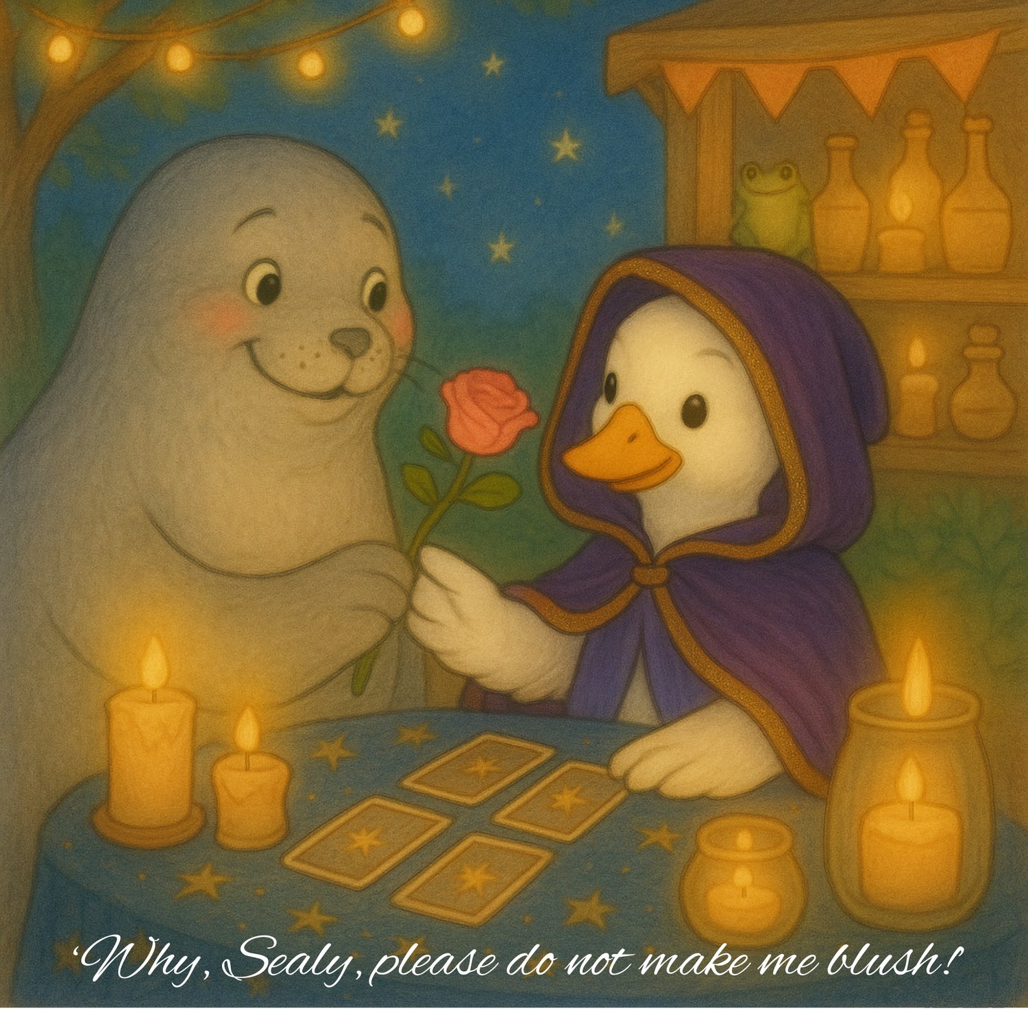 Whether predicting the future, winking at the neighbours, or causing a little chaos under the moonlight, Lach’s antics are as unpredictable as the stars themselves. Prepare for quacks, giggles, and more than a few flirty surprises.