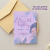 Designed with soft purple tones, a cute illustration, and elegant typography, this editable Canva template is perfect for a magical kids’ celebration.