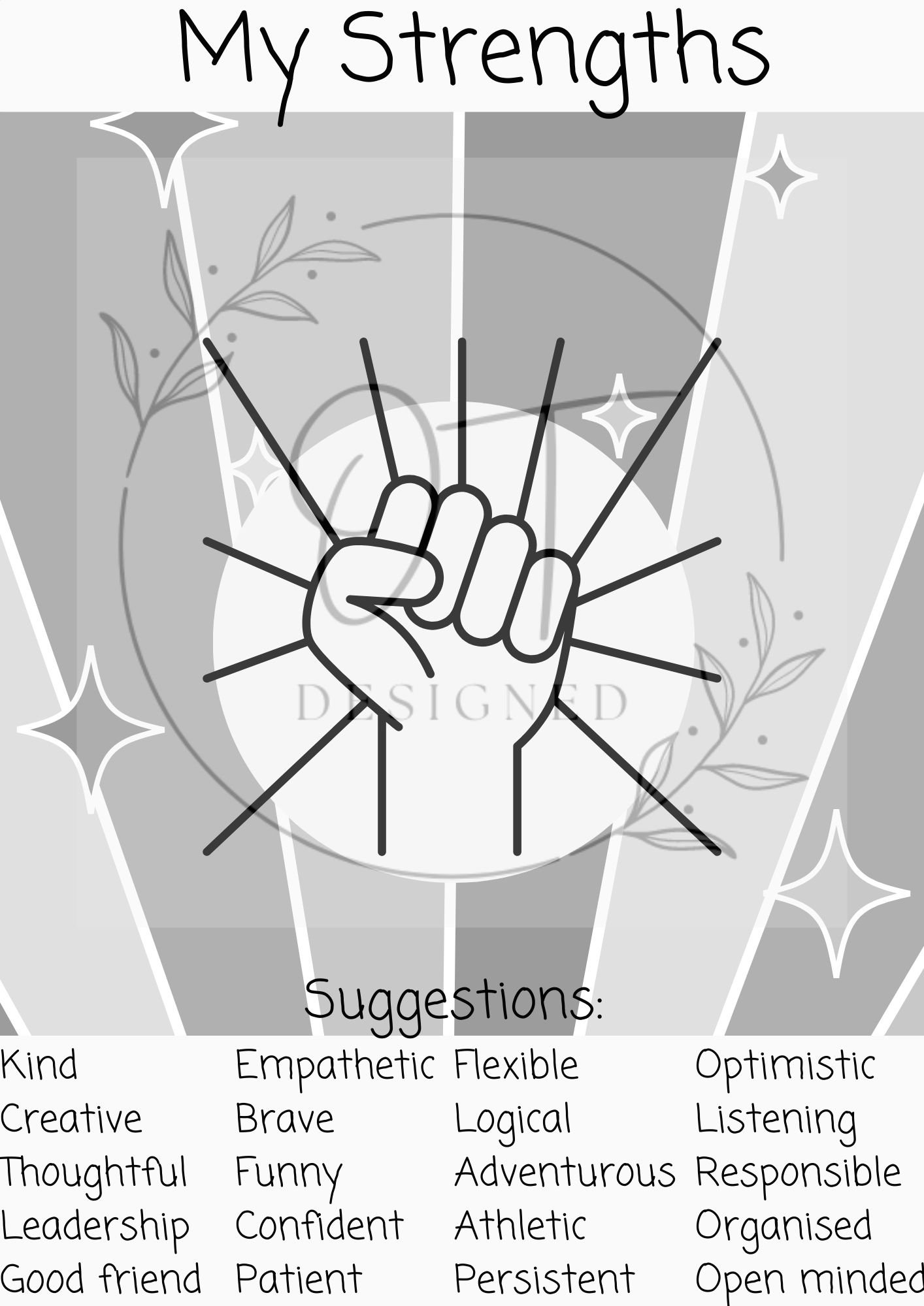 This worksheet is perfect for building up confidence by facilitating your client or child to identify their strengths. Don't be limited by the suggestions at the bottom of the page!
