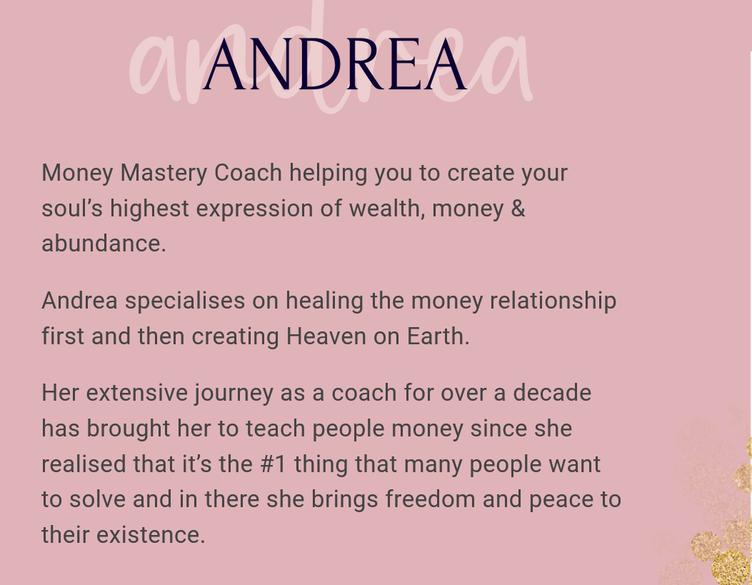 "I've had so many a-ha moments that I can't count. So much stuff makes sense now and I see where my limitations came from and how they affected my entire life. I have created greater freedom around money and my money consciousness has shifted for good! "