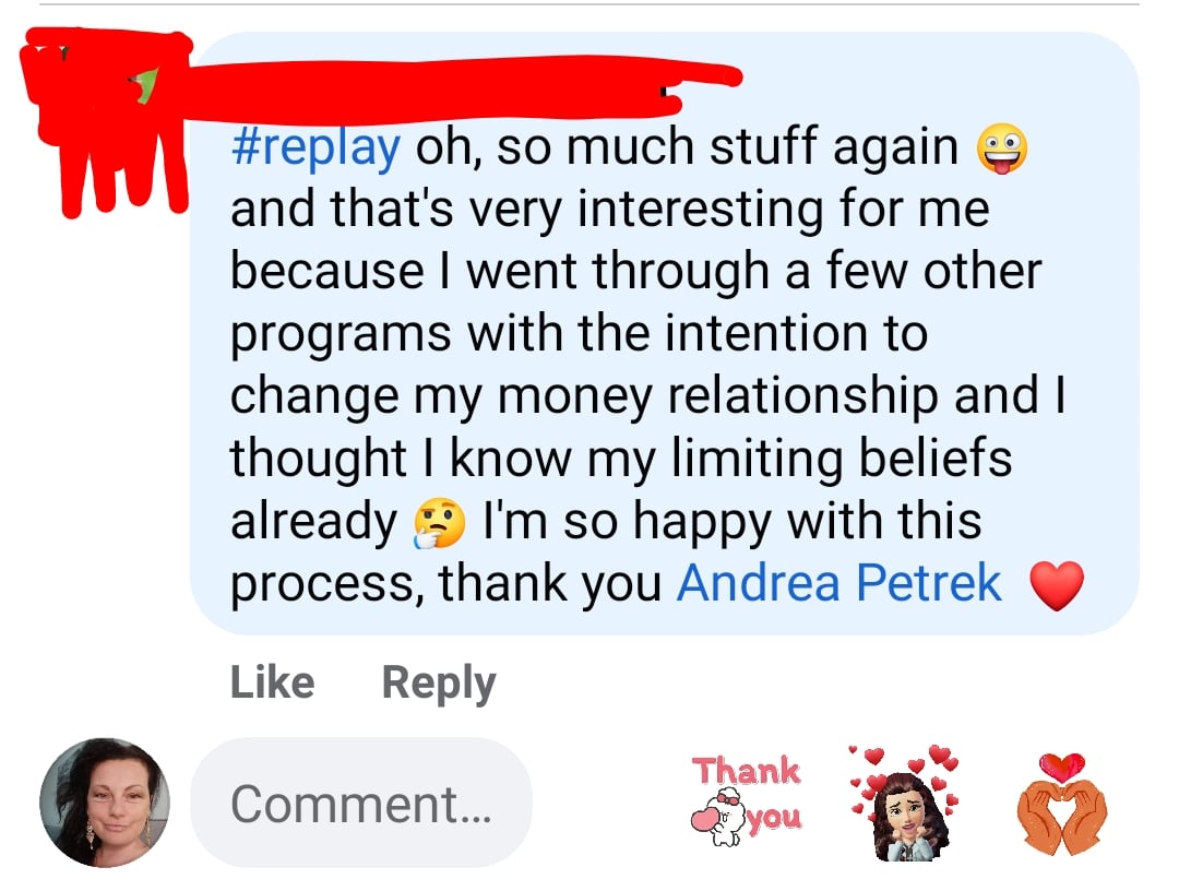 "I thought I've cleared my money blocks long time ago and yet, there is still so much coming up for me! Thank you for this eye-opening course and for the deep healing in it. "
