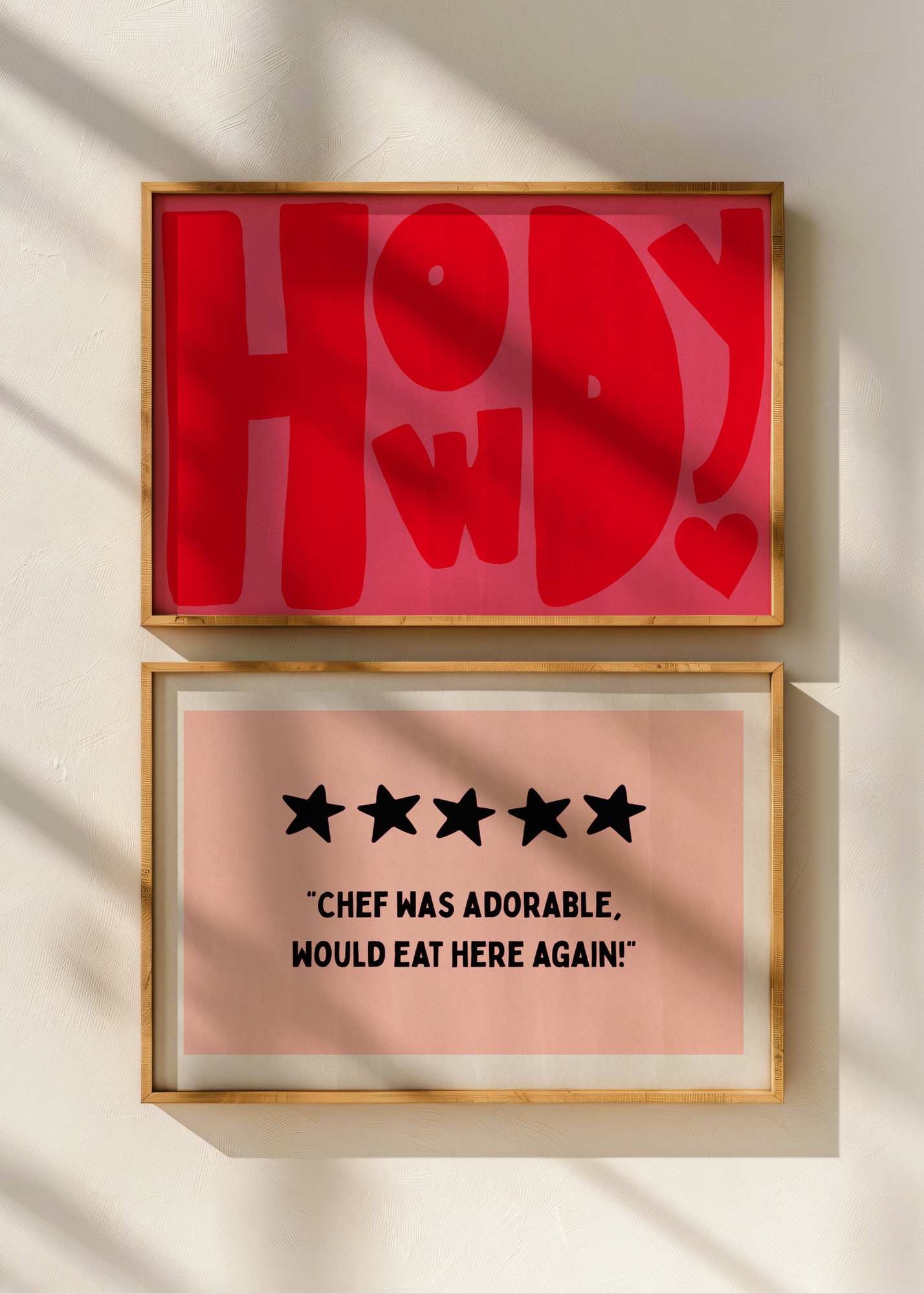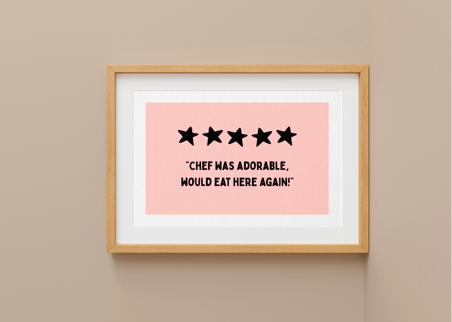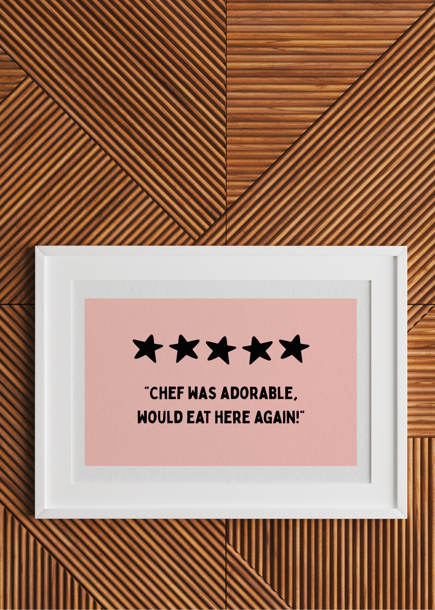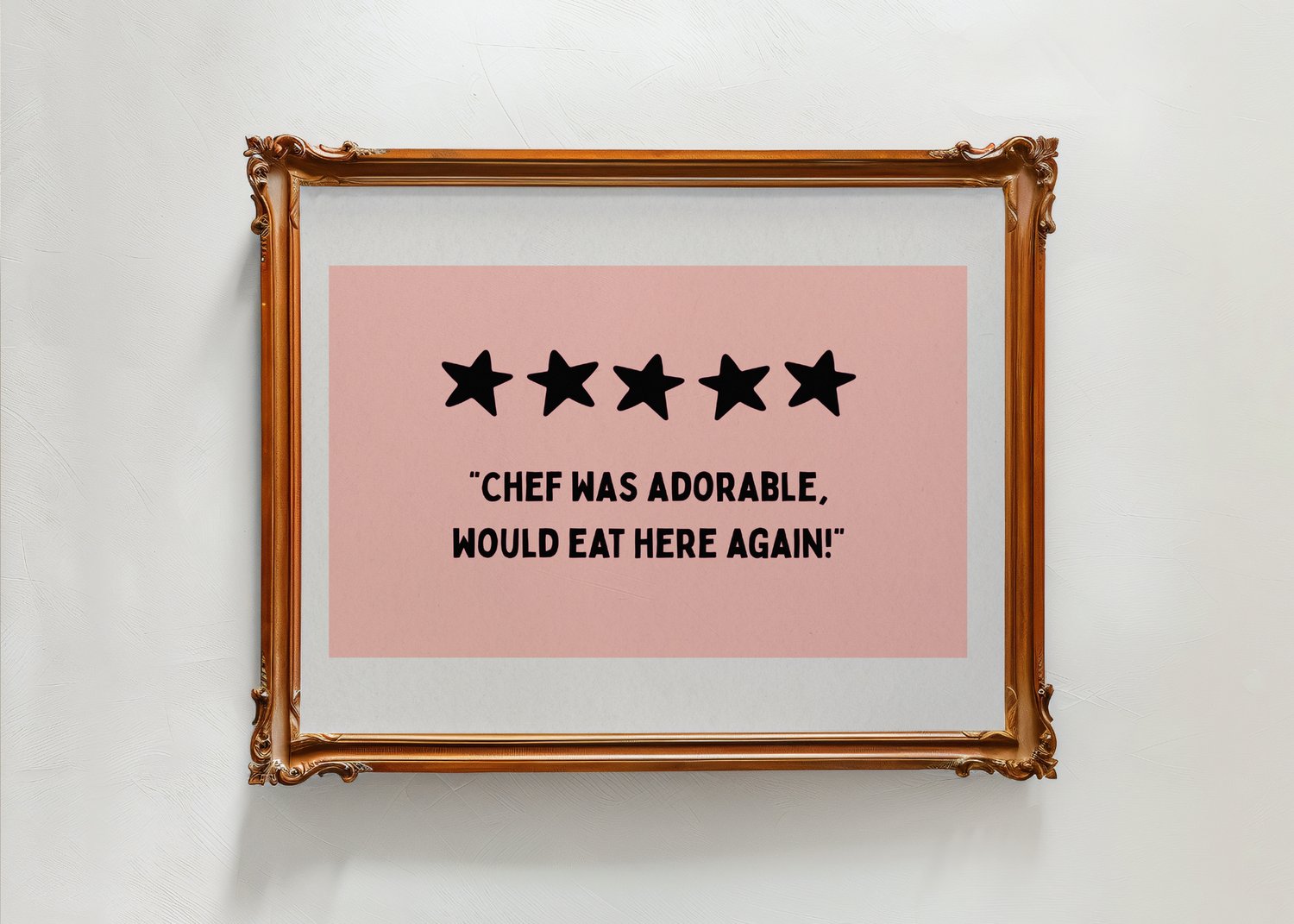 Chef Was Adorable— With its dusty rose background and bold five-star review, this cheeky print is both modern and playful. The quote— “Chef was adorable, would eat here again!”—is a wink to charming dinners, comfort food, and the irresistible magic of meals made with love. Perfect for kitchens and dining spaces that value laughter as much as flavor.