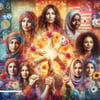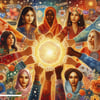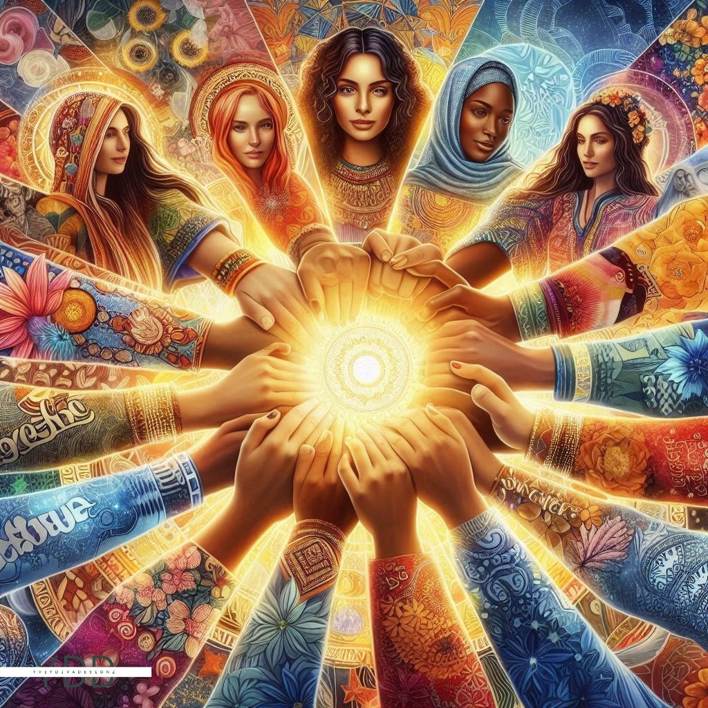 Description: A radiant celebration of unity and strength, this artwork showcases women from diverse cultures, their hands interlocked in a glowing circle of empowerment. Dressed in traditional and modern attire, they stand against a vibrant backdrop infused with symbols of resilience, progress, and hope. This piece embodies the unbreakable bond of sisterhood that transcends borders.
