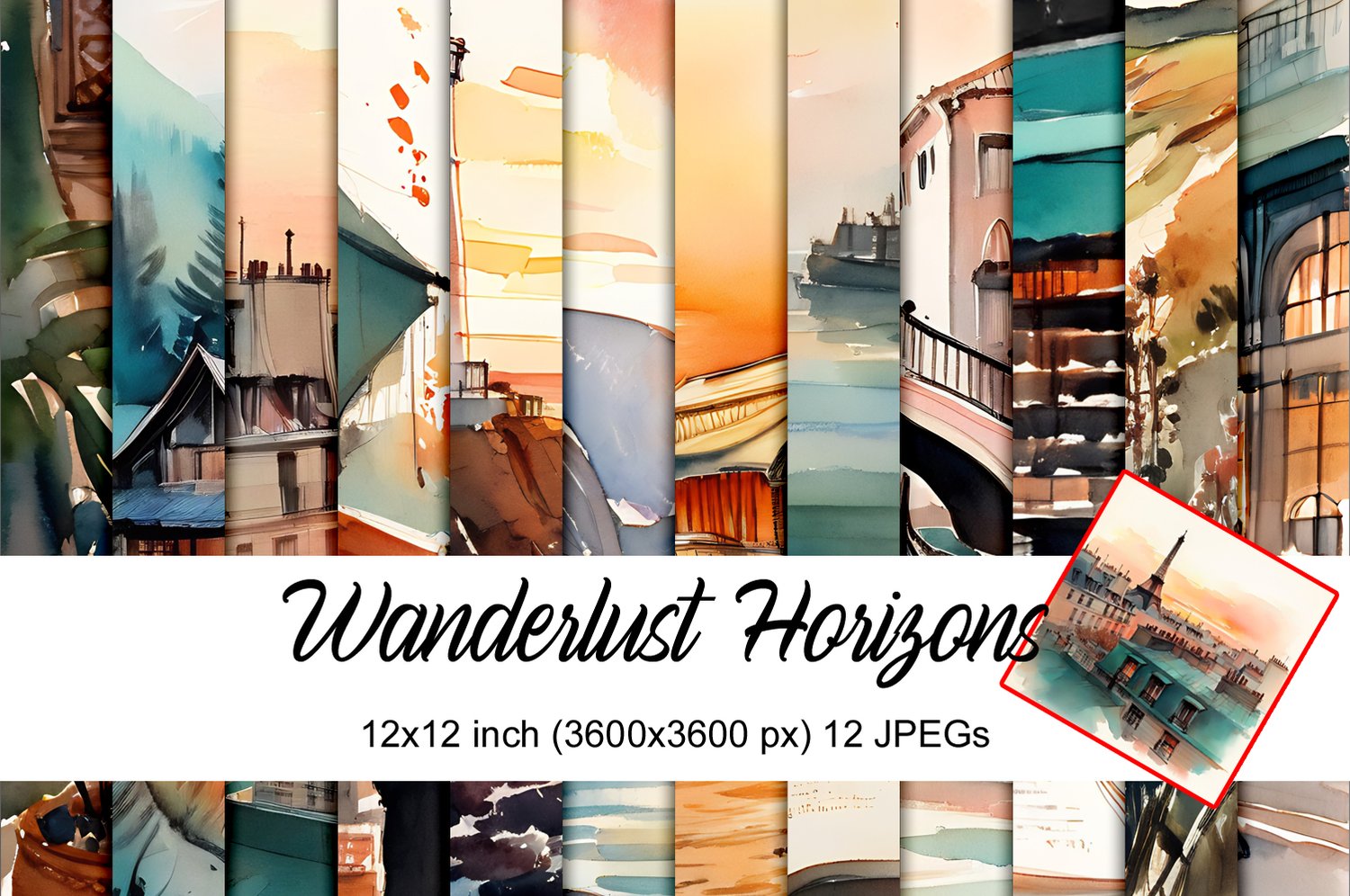 Keywords: Wanderlust Horizons Digital Paper, Watercolor Travel Scenes, Sunset Landscape Backgrounds, Venice and Paris Journal Papers, Scenic Lighthouse Scrapbook Art, Global Vista Watercolor Textures, Watercolor Art, Travel Theme, European Scenery, Junk Journaling, Scrapbook Supply, Commercial Use, Sunset Colors, 300 DPI, Digital Download, Adventure Art, Nautical and Mountain.