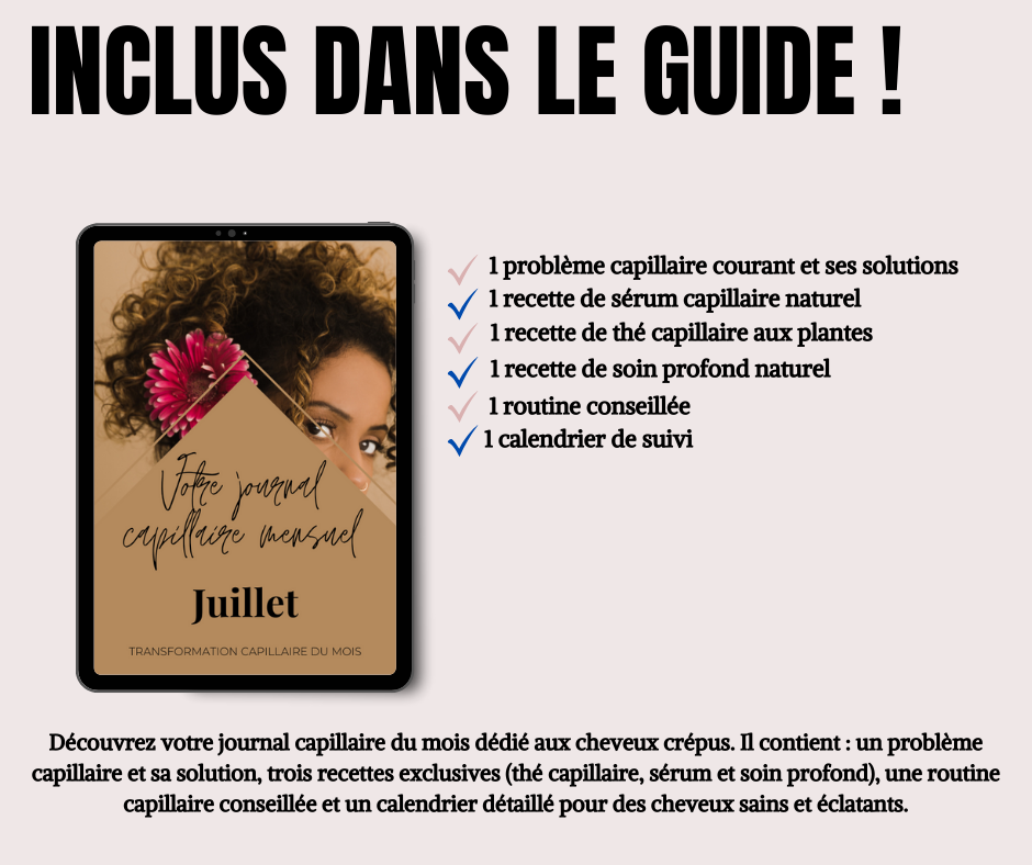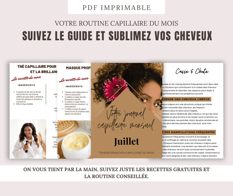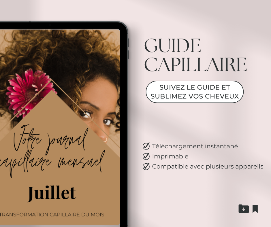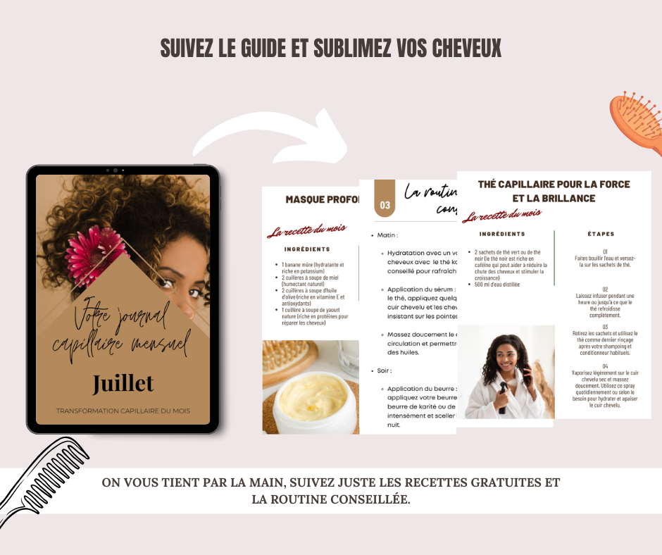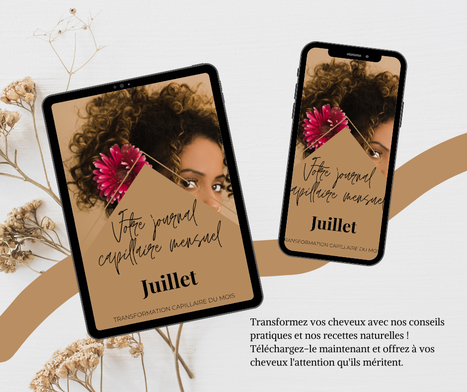 Que vous soyez en quête de remèdes pour renforcer vos cheveux, des astuces pour booster leur croissance ou des méthodes pour les garder hydratés et brillants, "Votre Journal Capillaire de juillet" est votre guide indispensable. Préparez vous à vivre l'été avec des cheveux magnifiques, bien préparés pour affronter la chaleur et l'humidité !