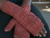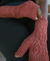 These fingerless mitts are worked in the round from cuff edge to finger opening. Thumb stitches are increased then set aside to be completed