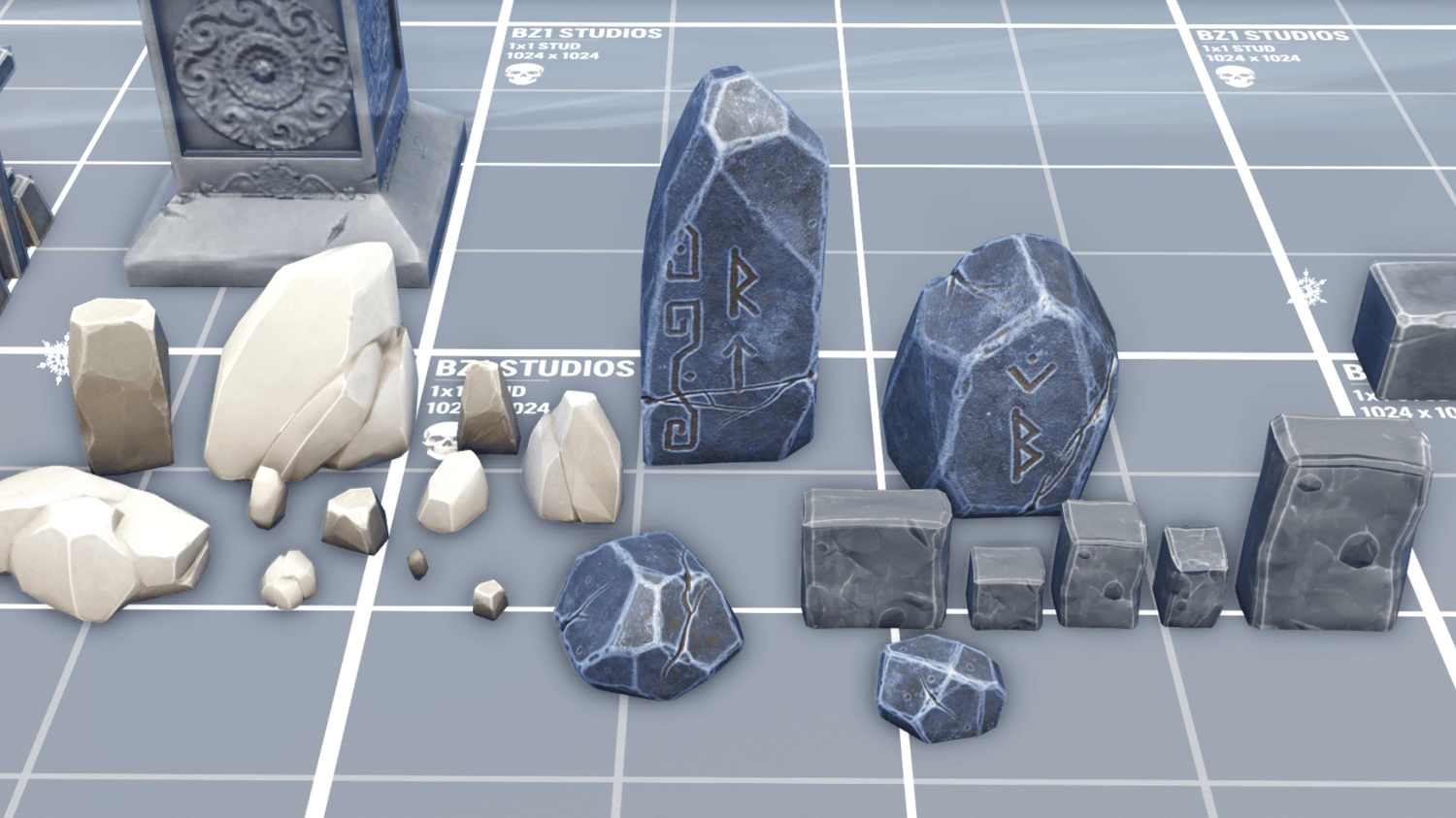 Stylized rocks in various shapes and sizes as well as rune stones and other decorative elements