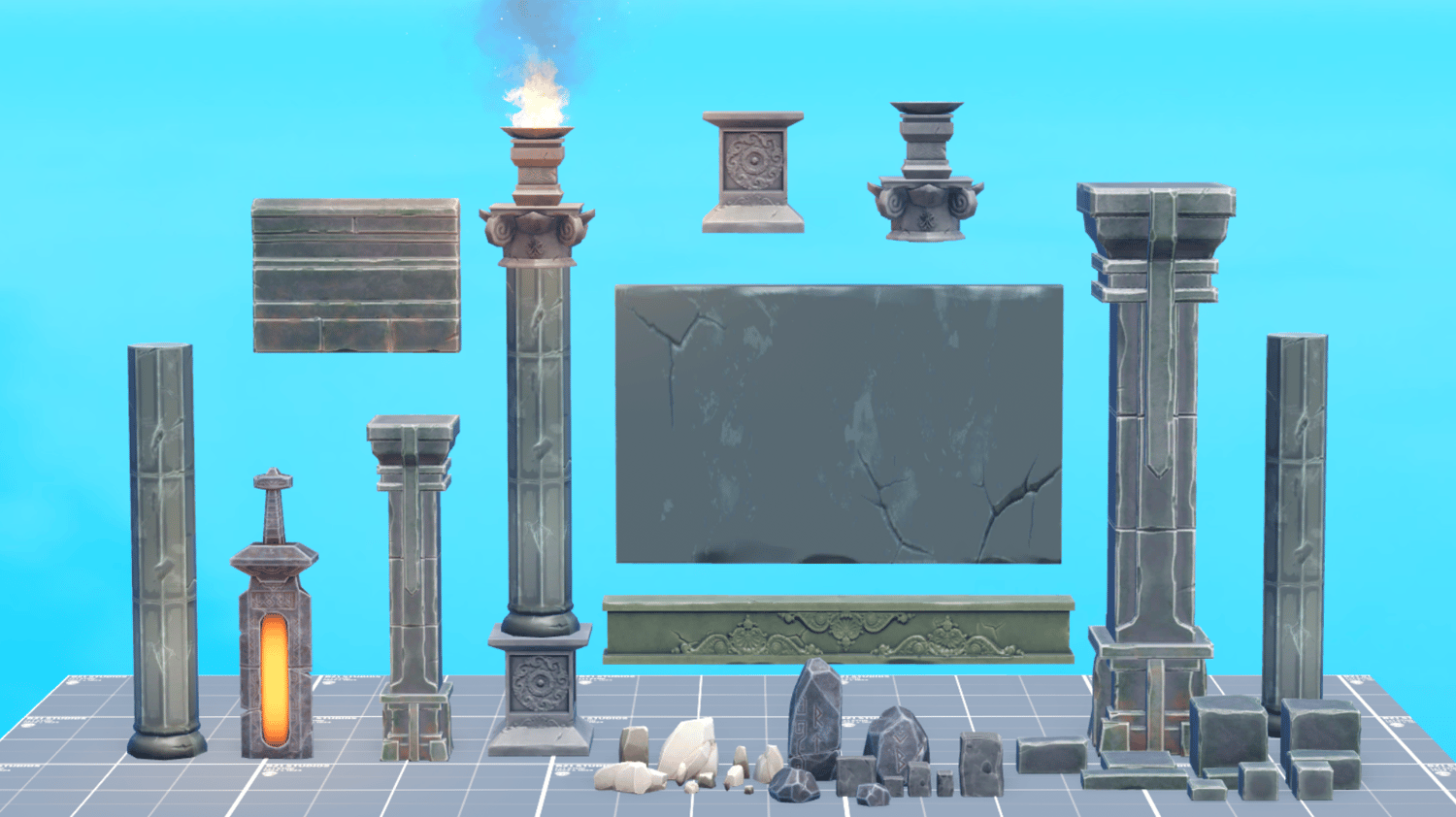 A modular asset pack for building ancient or fantasy environments with pillars, walls, and rocks.