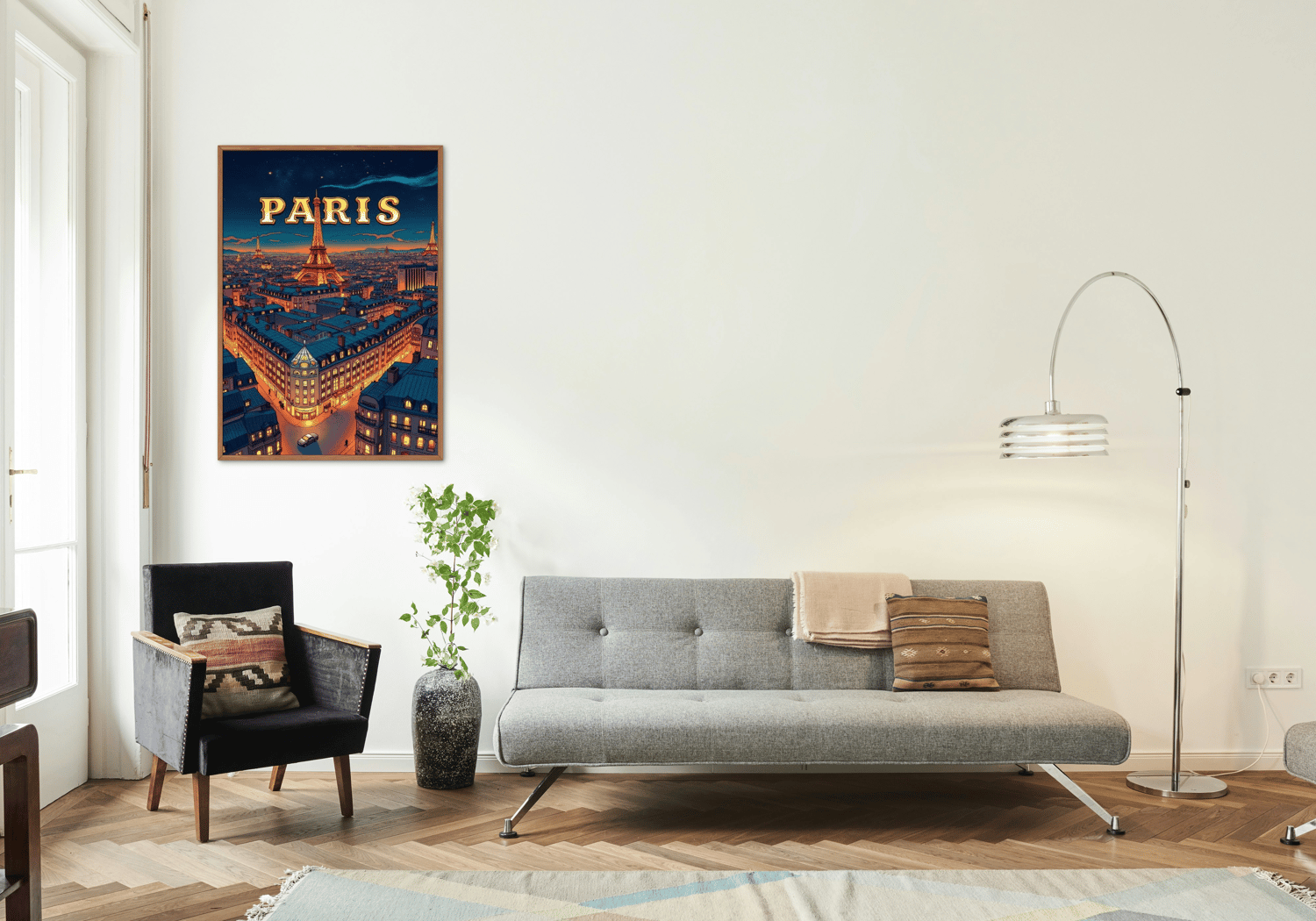 Inspirée par l’élégance parisienne, la Tour Eiffel, les toits emblématiques et l’âme artistique de la capitale, cette affiche digitale transforme n’importe quel espace en véritable escapade visuelle.