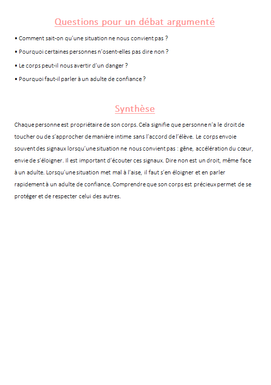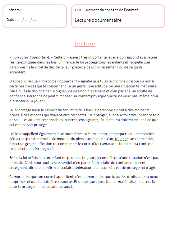 Ressource pédagogique CM1 – CM2 – 6e | EMC / EVAR – Respect du corps, intimité, consentement