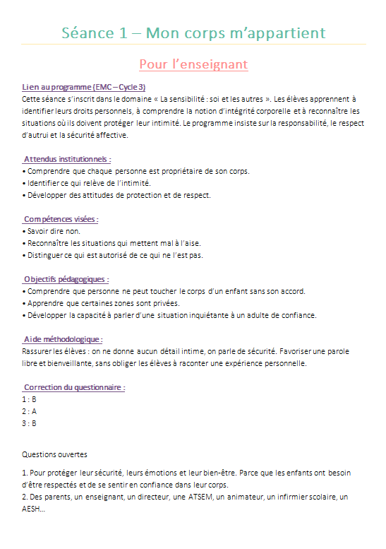Cette séquence complète de 5 séances EVAR pour le Cycle 3 permet d’aborder, avec un cadre sécurisant et des mots adaptés, des notions essentielles : “mon corps m’appartient”, être à l’aise / pas à l’aise, zones d’intimité, consentement, et adultes de confiance.
