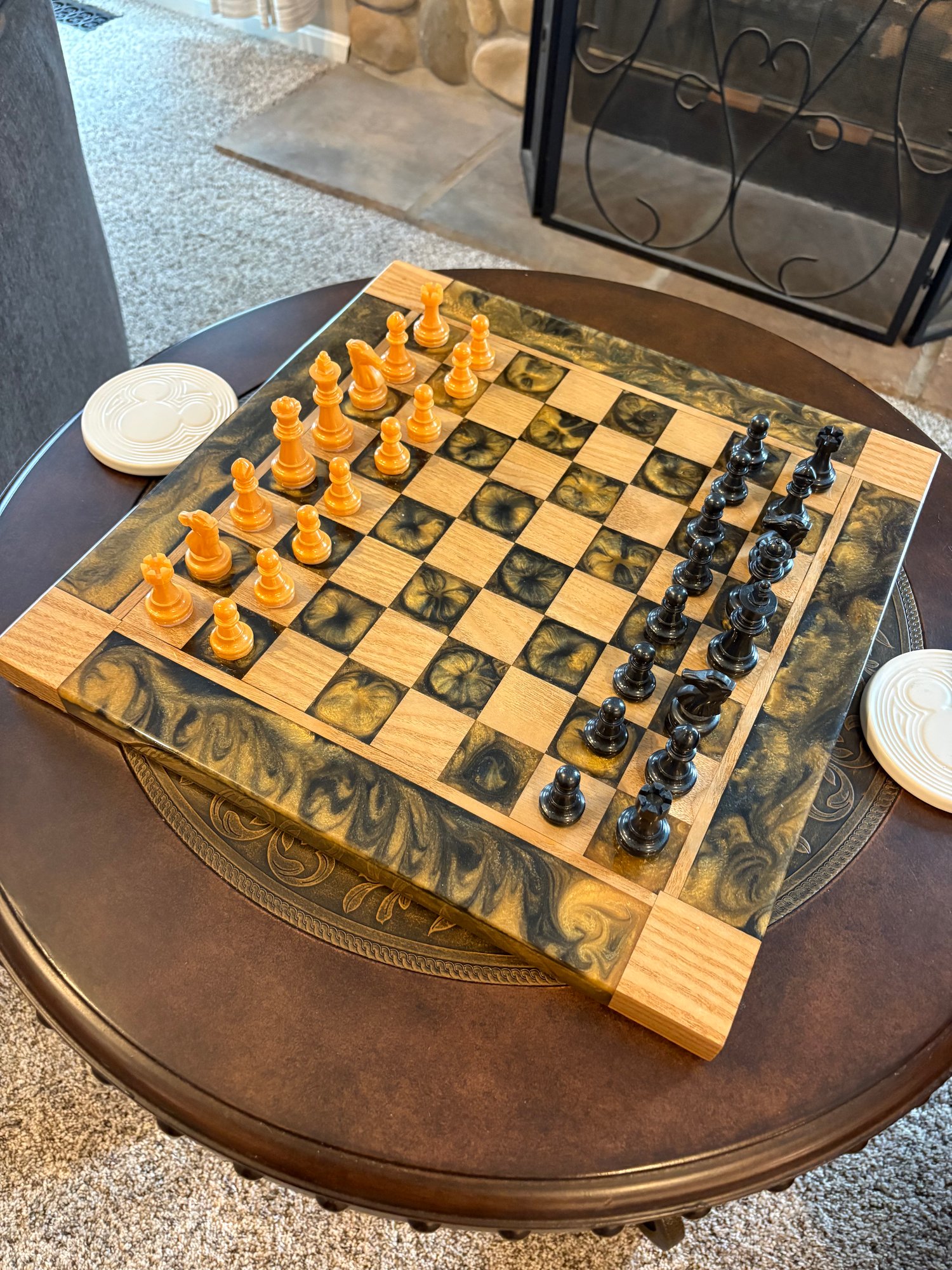This chess board is built out of cedar wood and pigmented epoxy. Each square is cut from a single cedar 2x4, arranged in the mold, and cast in a resin pour. The wood grain flows through the light squares, while the dark squares are solid pigmented epoxy — no paint, stain, or veneer. The example throughout the plans uses cedar wood but any type of wood could be used to make this product.