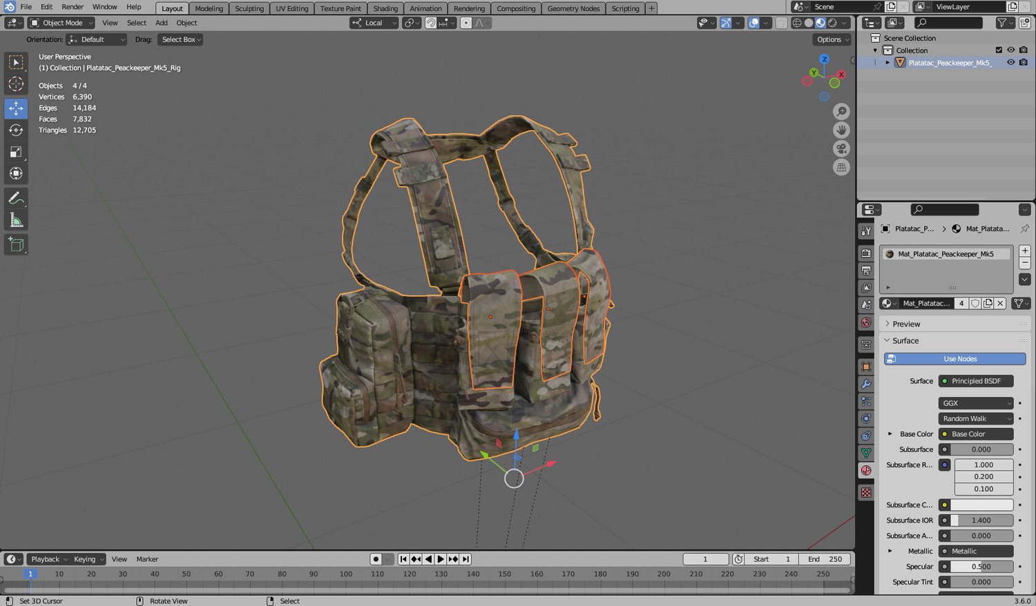 3D model of PLATATAC Peacekeeper Mk5 Chest Rig, designed for precision in military and tactical projects. Great for games such as Arma 3, DayZ, Reforger, Ready or Not, etc. The magazine flaps like on the real life counterpart are removable so you can fit longer magazines. This model was made with care and with easy rigging in mind demonstrated by the grid-like topology.