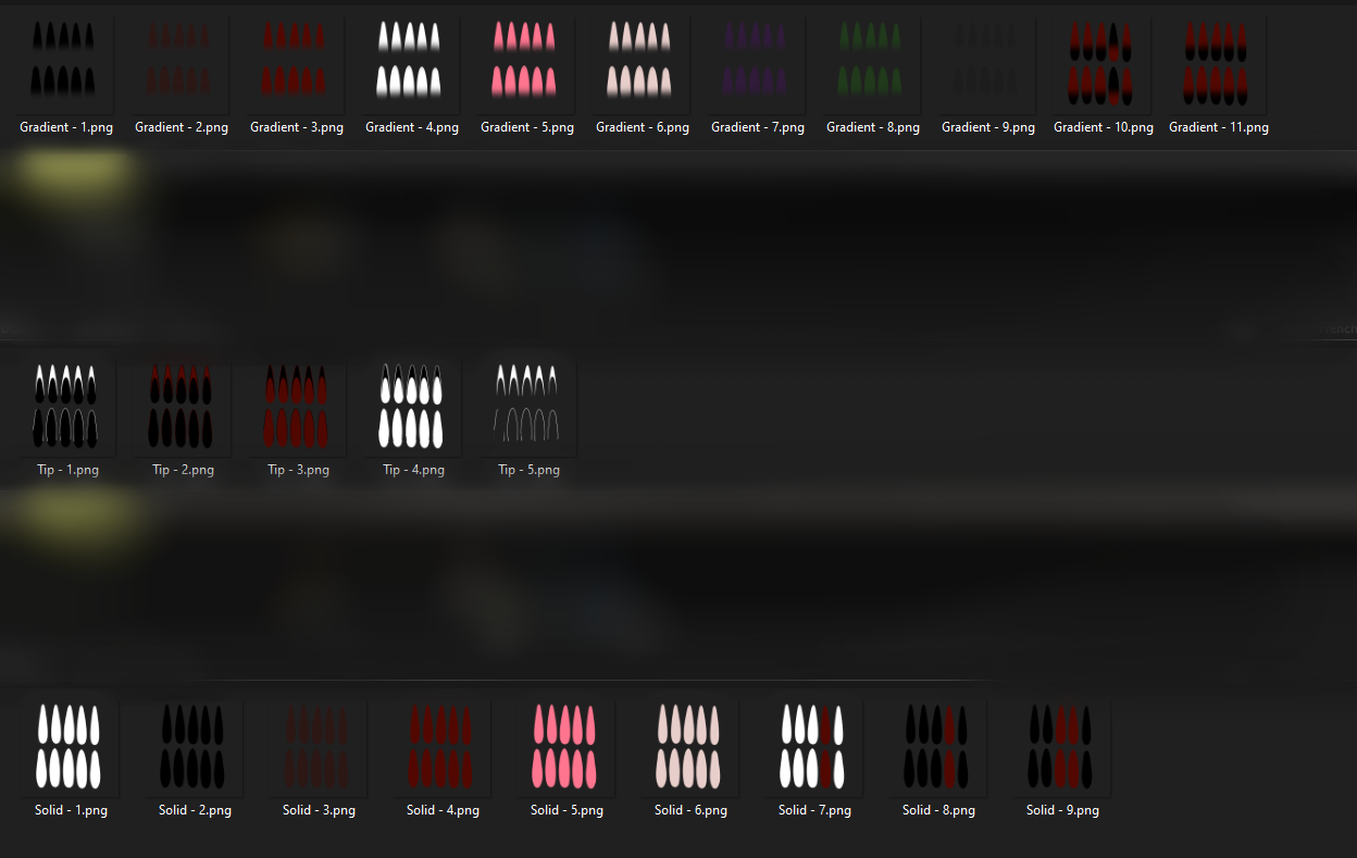 - 11 Gradients(Transparent to work with any skintones) : Black, Maroon, Red, White, Grey, ETC