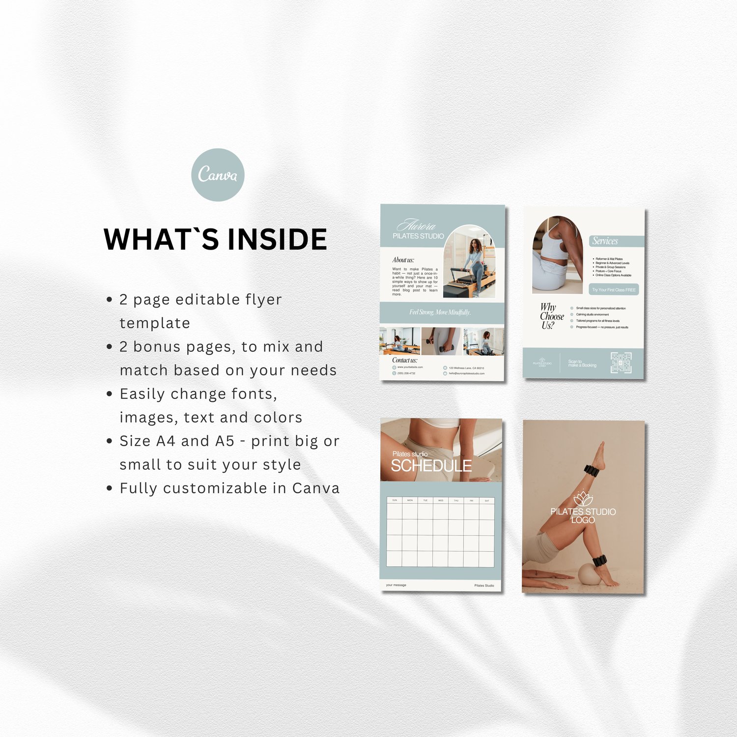 Pilates Studio Flyer Template | Editable Canva Design | 2-Page Double-Sided Pilates Studio Marketing Flyer | Bonus Schedule Template & Back Page