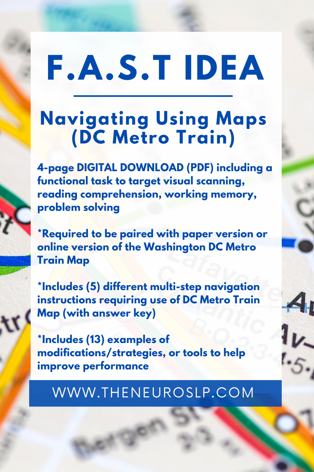 If you would like to practice these skills with patients, pair this “Navigating Using Maps” F.A.S.T Activity Guide with the map provided in your next therapy session. NOTE: This activity is specific to using the Washington DC Metro Train map. However, feel free to recreate something similar using a map of your local transit system.