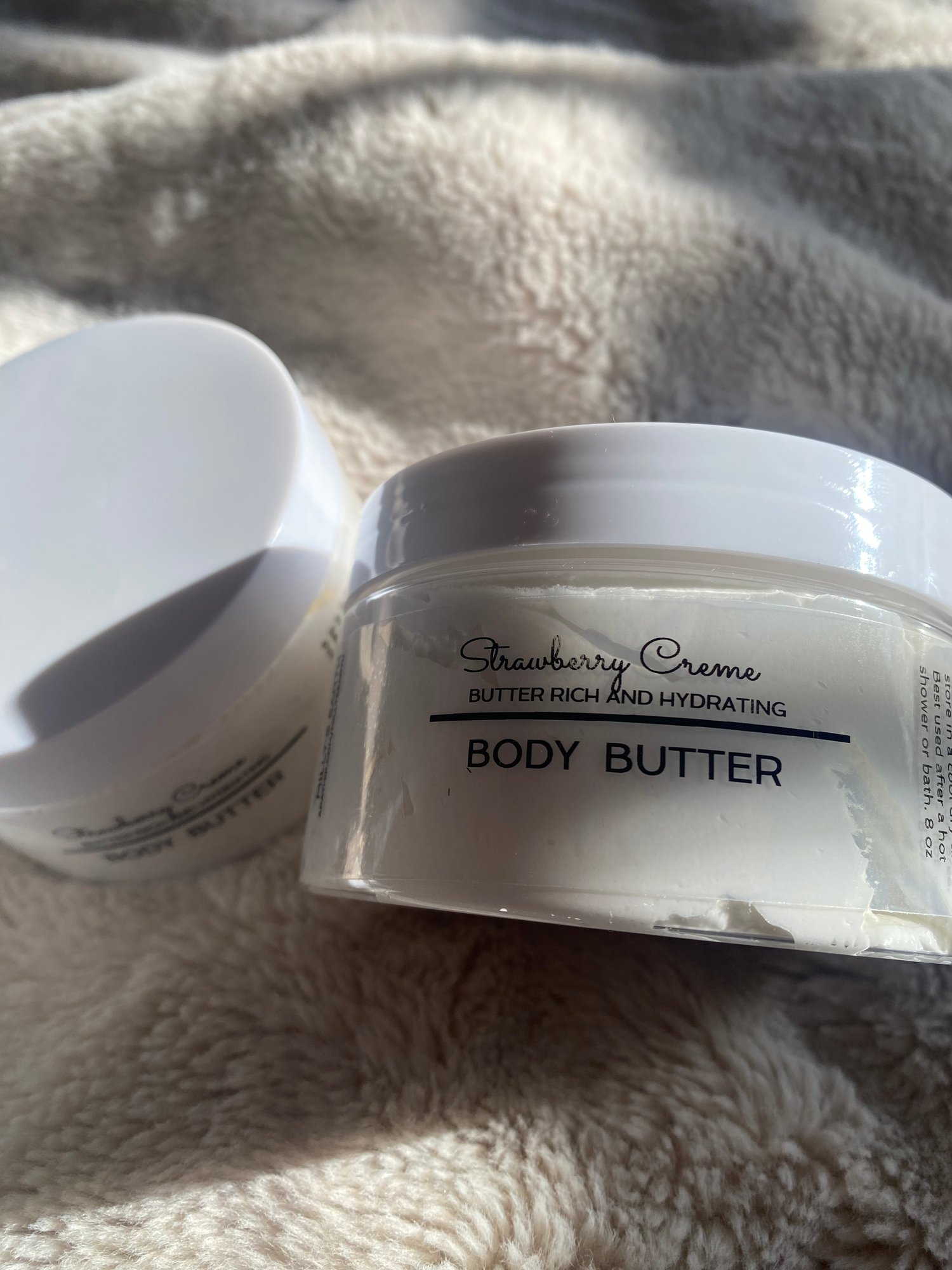 Large jar of moisturizing hydrating body butter specially formulated and scented for the holiday season.