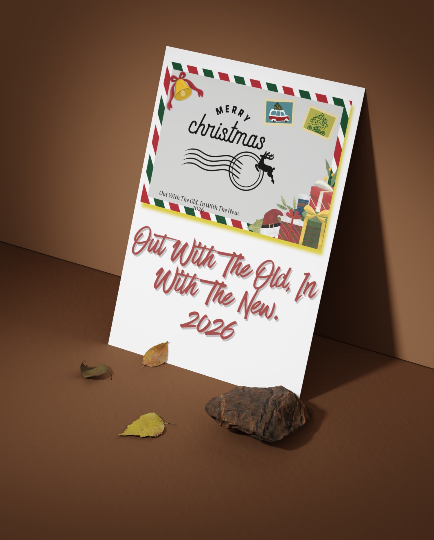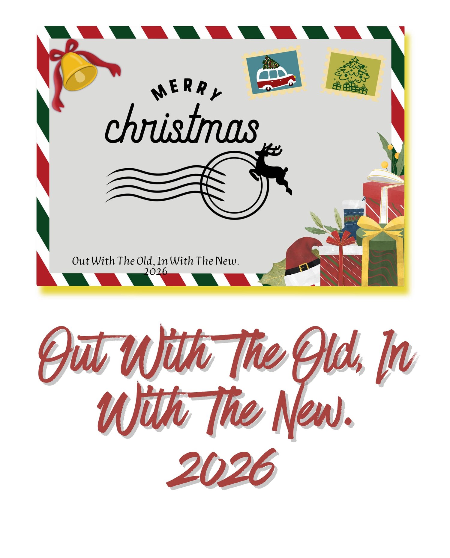 This digital design embodies hope and renewal with the powerful message "Out with the Old, In with the New" inscribed on a classic envelope bearing a Merry Christmas greeting. Ideal for content creators, invitation designers, or for DIY print projects.