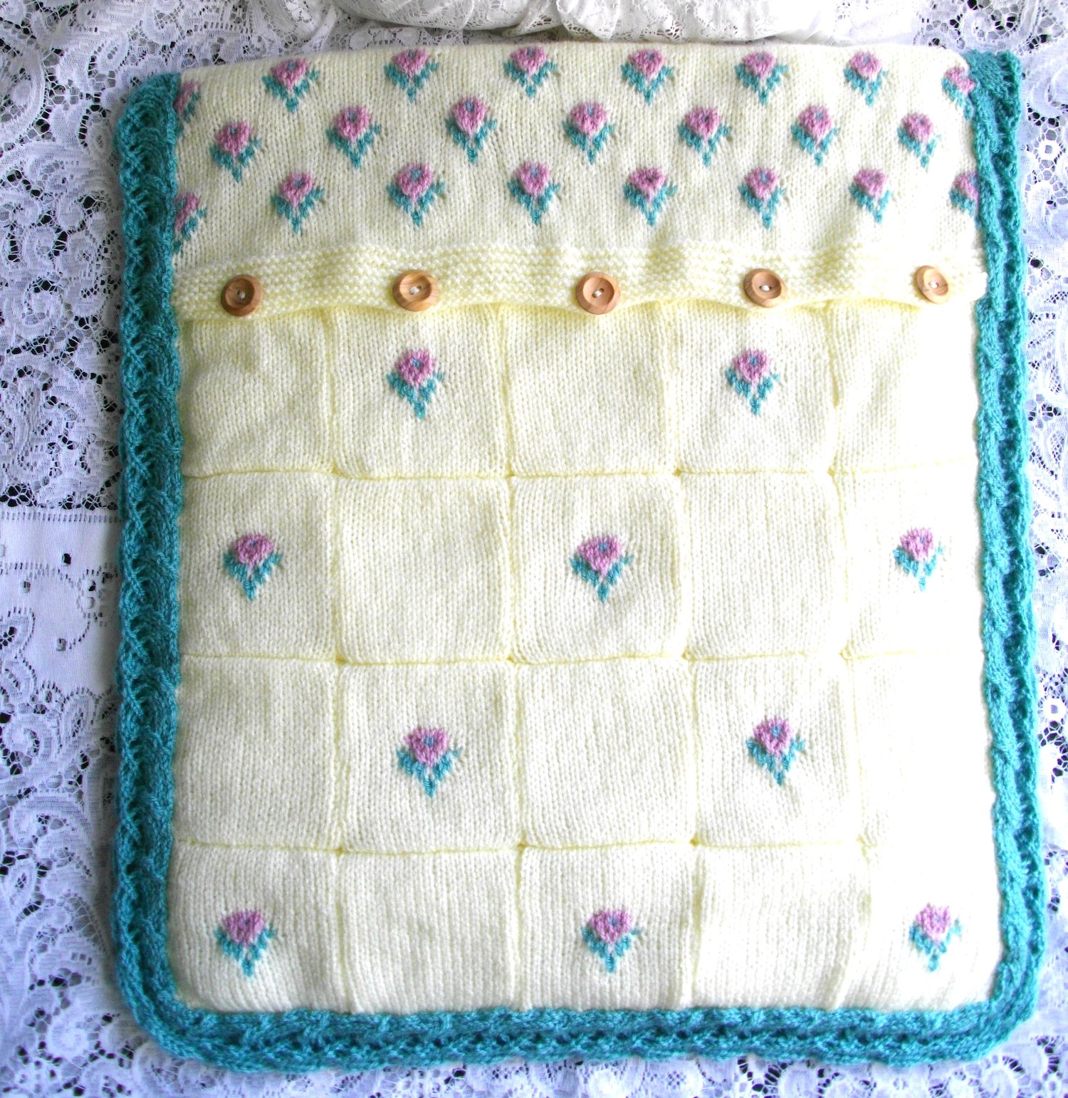 This pram quilt is fully reversible and double-thickness, with the same design on both sides. The lily motif is worked from a chart, and the quilt body is made up of individual knitted squares, which are sewn together after knitting. The squares may be arranged to suit your own design preferences.