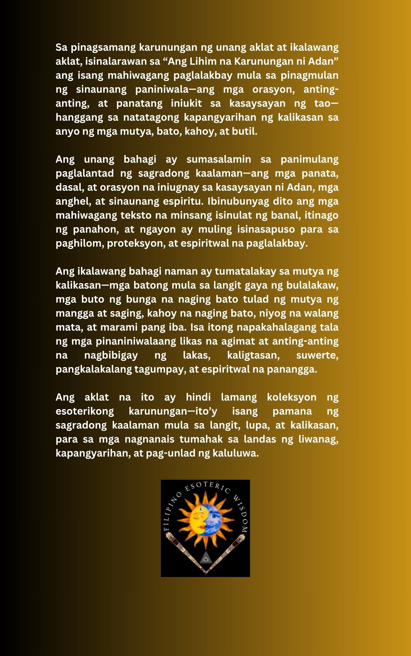 Ang aklat na ito ay hindi lamang koleksyon ng esoterikong karunungan—ito’y isang pamana ng sagradong kaalaman mula sa langit, lupa, at kalikasan, para sa mga nagnanais tumahak sa landas ng liwanag, kapangyarihan, at pag-unlad ng kaluluwa.