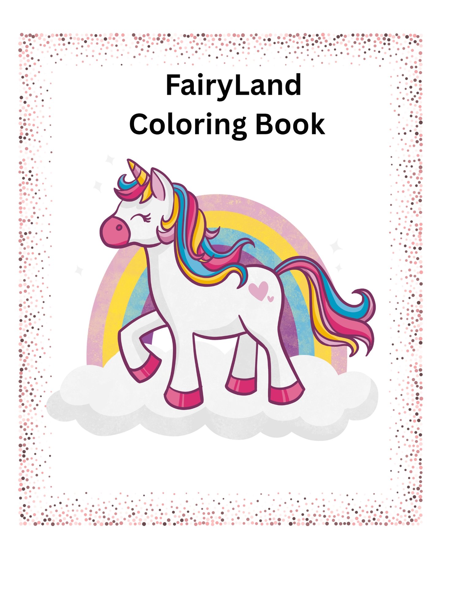 FairyLand Coloring Book is a magical and engaging activity book designed to spark imagination, creativity, and relaxation for children and unicorn lovers of all ages. Featuring a charming unicorn standing proudly on a soft cloud beneath a vibrant rainbow, this coloring book invites young artists into a whimsical fantasy world filled with wonder and joy.