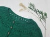Skills Needed: Work flat; knit and purl; cast on and bind off; pick up and knit (instructions given); short rows (instructions given); knitted increases and decreases – m1, k2tog, ssk, yo; sew on buttons, lace knitting involves gathered stitches (instructions given).