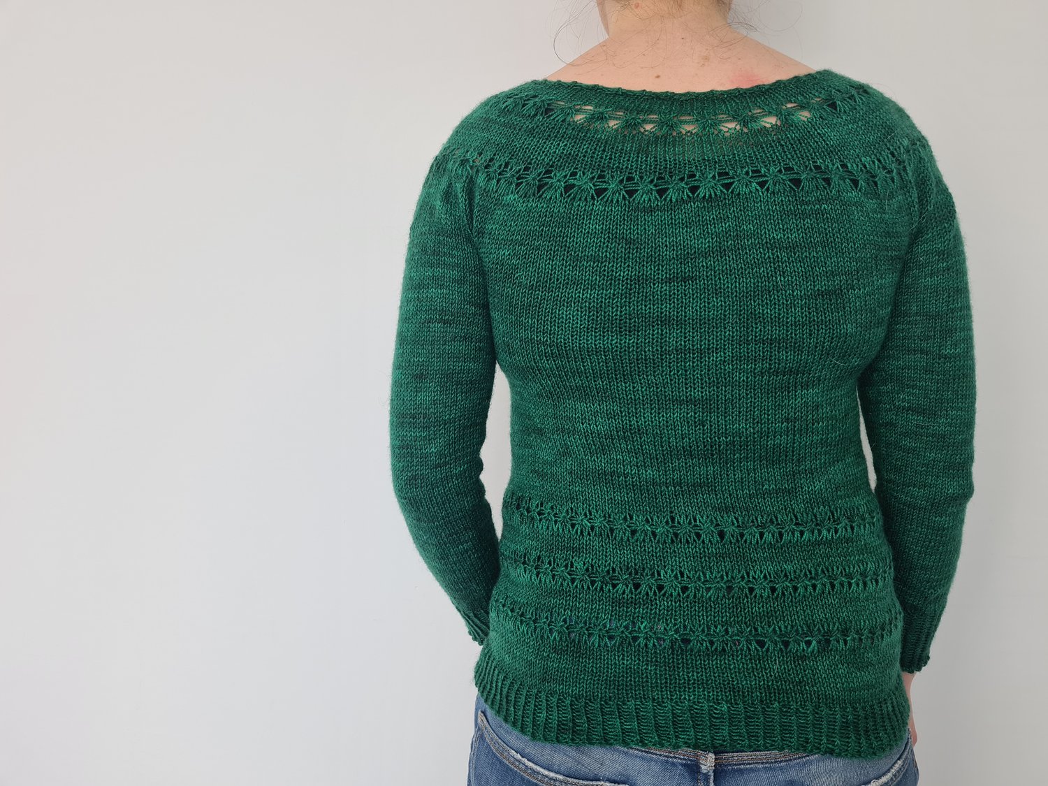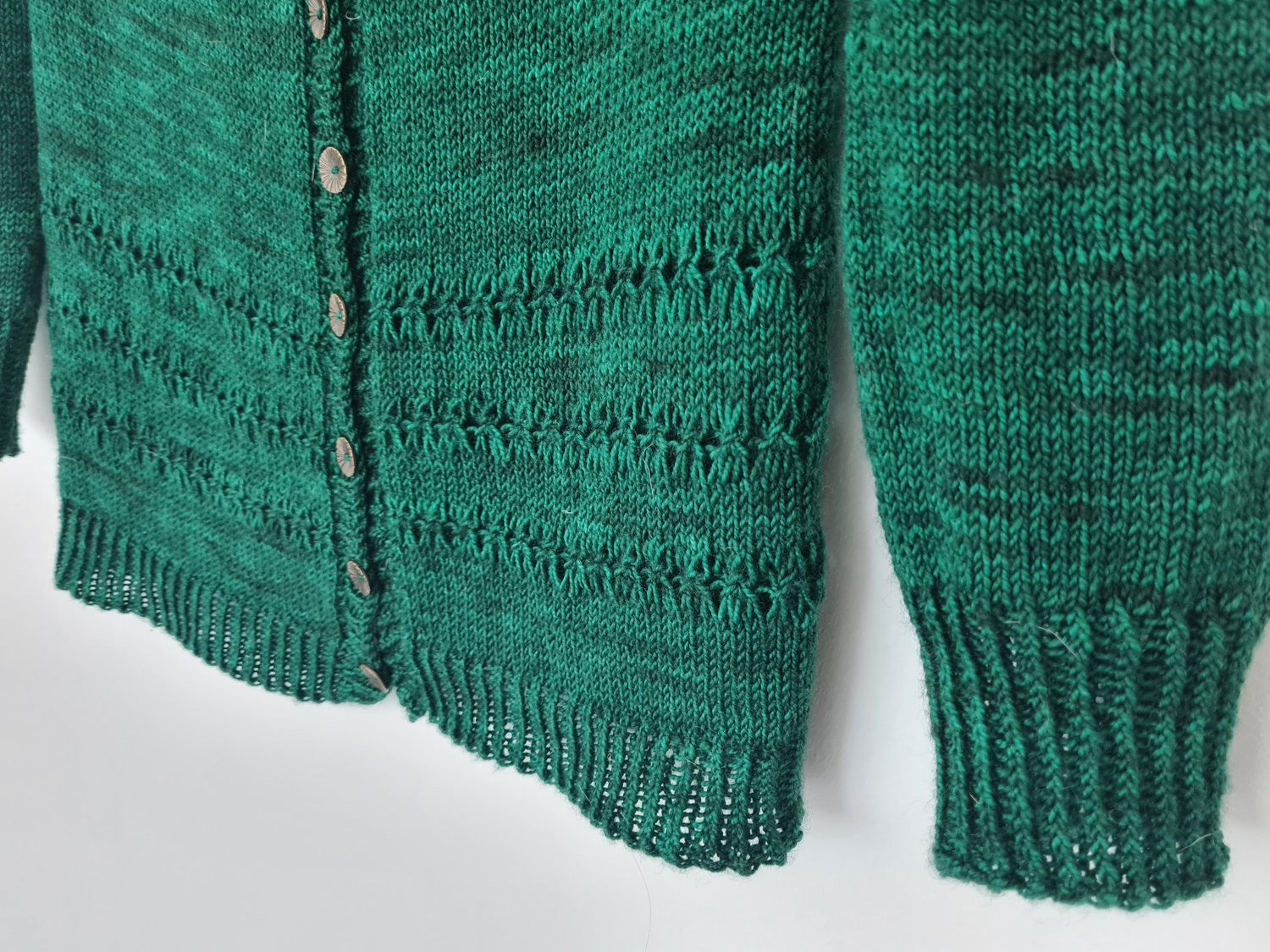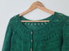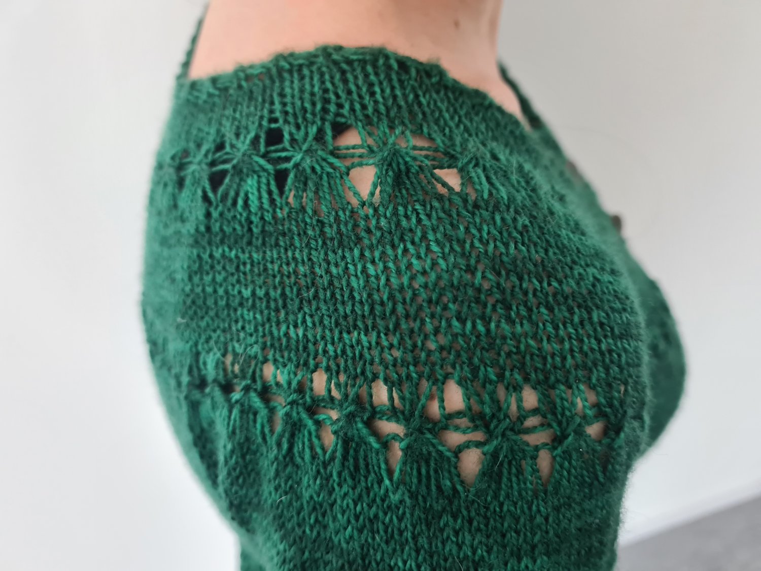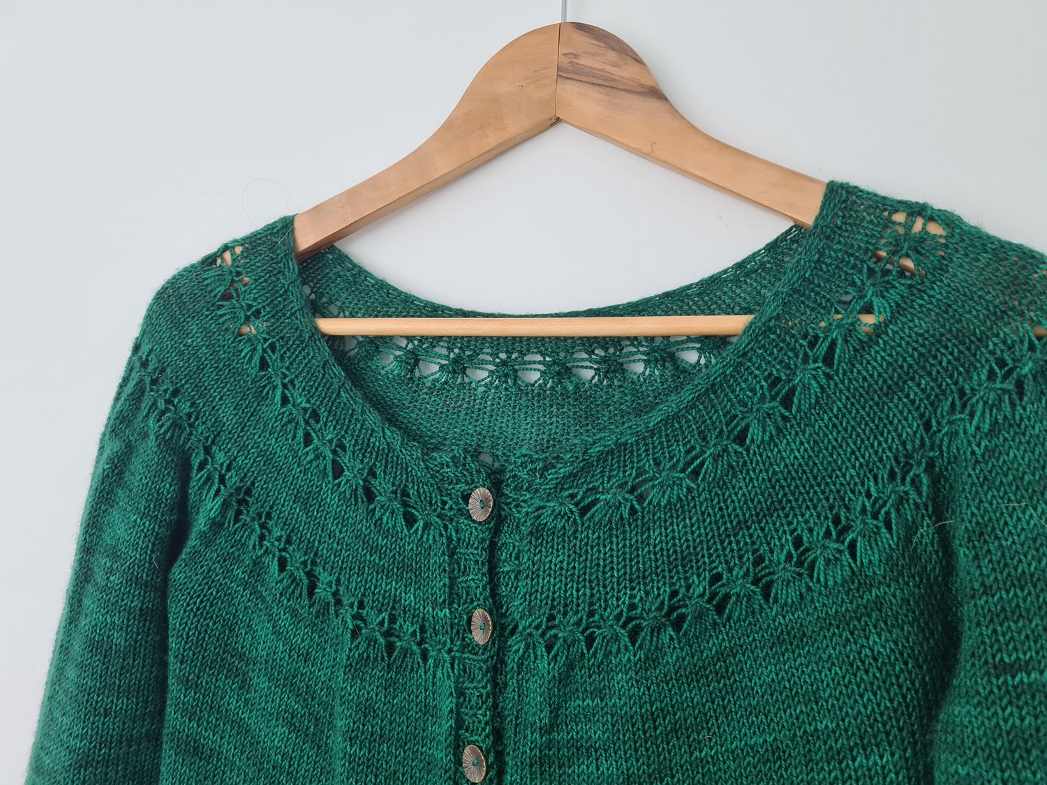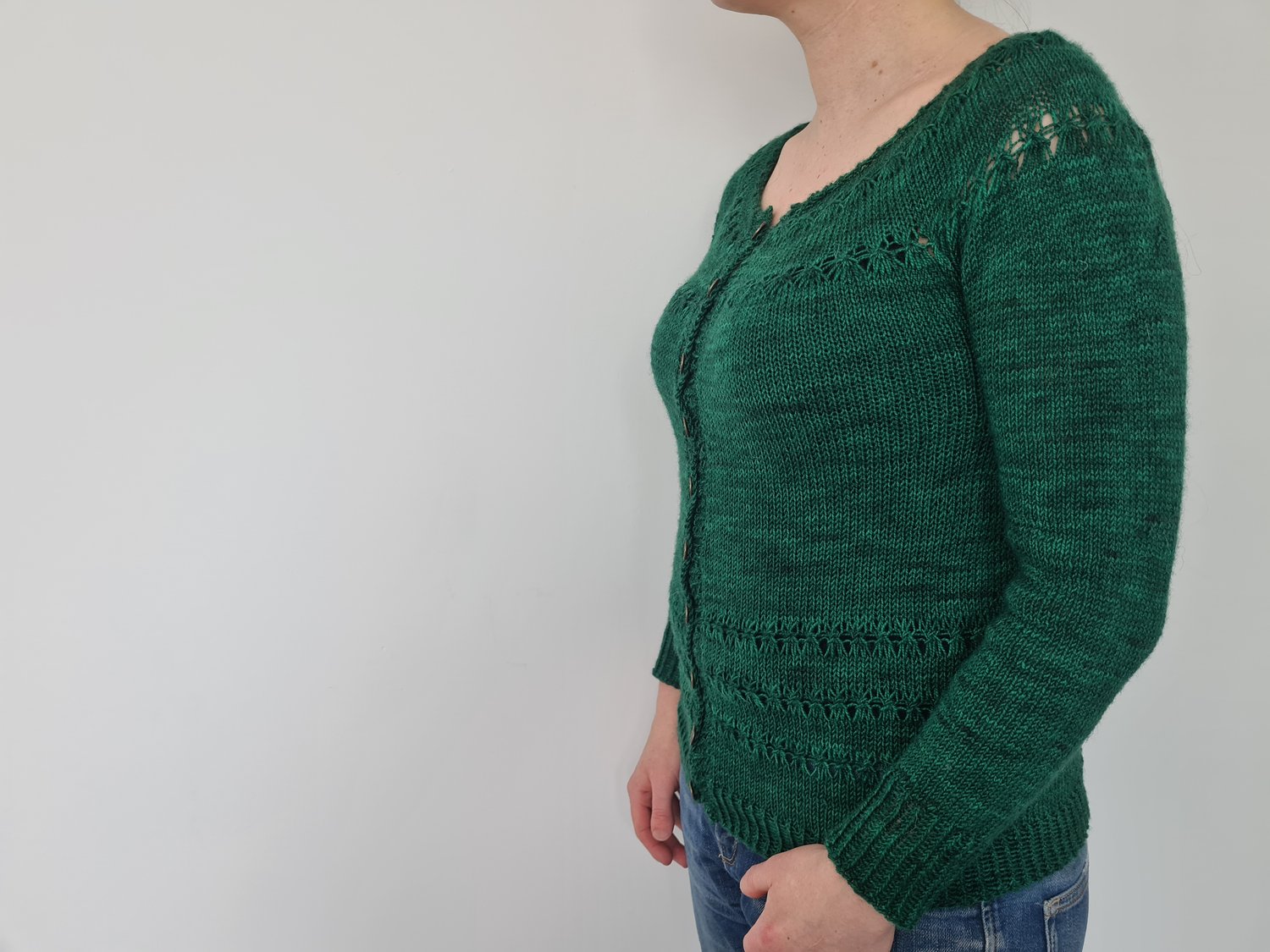 A beautiful cardigan with instructions for long or short sleeves – the perfect garment for transitioning between the seasons. A top down, seamless cardigan with a stunning lace design. The photo shows the 80 cm/32” cardigan on a model with 85 cm/34” chest