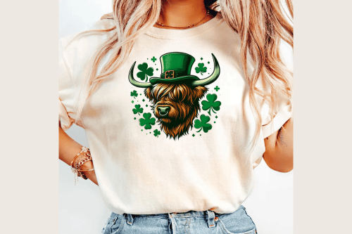 - Charming Highland Cow Design: A sweet, endearing Highland cow surrounded by shamrocks, bringing a touch of whimsy to St. Patrick’s Day.