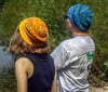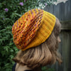Unplanned Peacock Twinkle Twist Superwash Merino, Nylon and Stellina 400 yards/100 grams, Slouchier used 30 grams of Sapphire and 15 grams of Icy Rainbow, Less Slouchy used 25 grams of Butterscotch and 11 grams of Spicy Rainbow