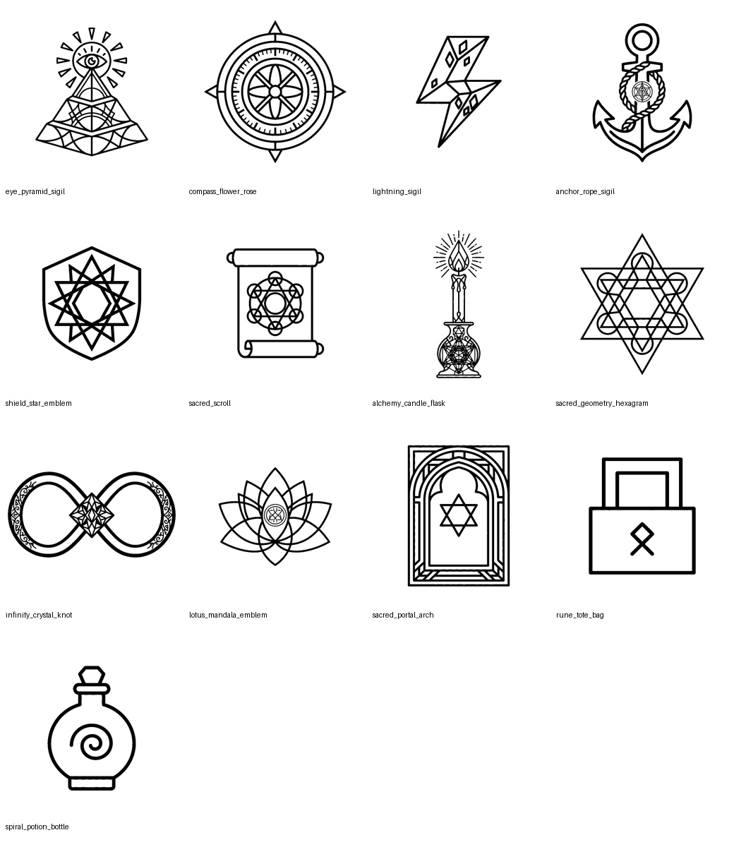 This icon set features sacred geometry, spiritual symbols, occult-inspired line art, and clean mystical designs, delivered in both SVG and transparent PNG formats for easy use across digital and creative projects.