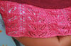 B: 325 yards (274 m) fingering weight yarn. Shown in Sweet Georgia Tough Love Sock (80% merino, 20% nylon; 389 m / 425 yds per 115 g), Raspberry.
