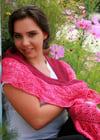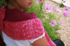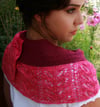 A: 375 yards (343 m) lace weight yarn. Shown in Sweet Georgia CashSilk Lace (55% silk, 45% cashmere; 366 m / 400 yds per 50 g), Orchid
