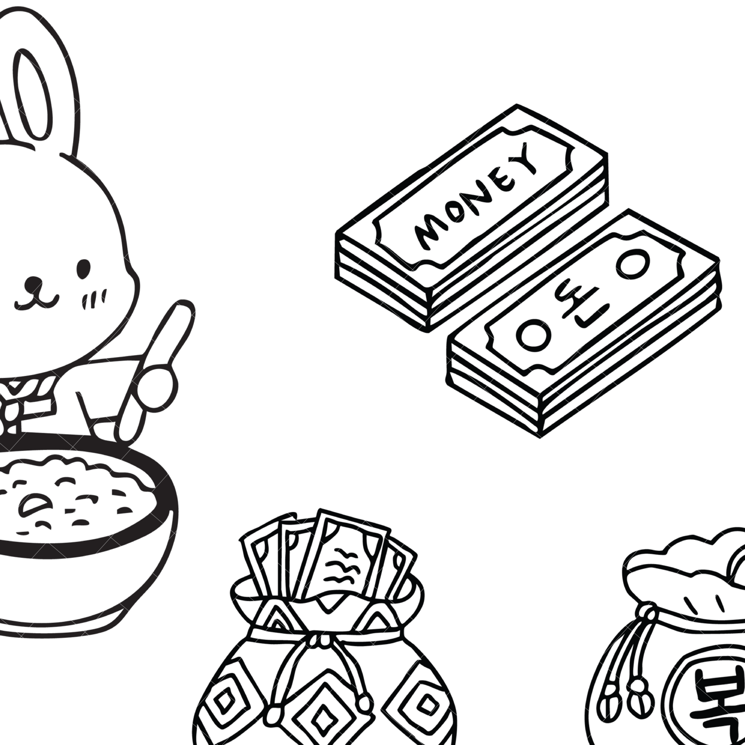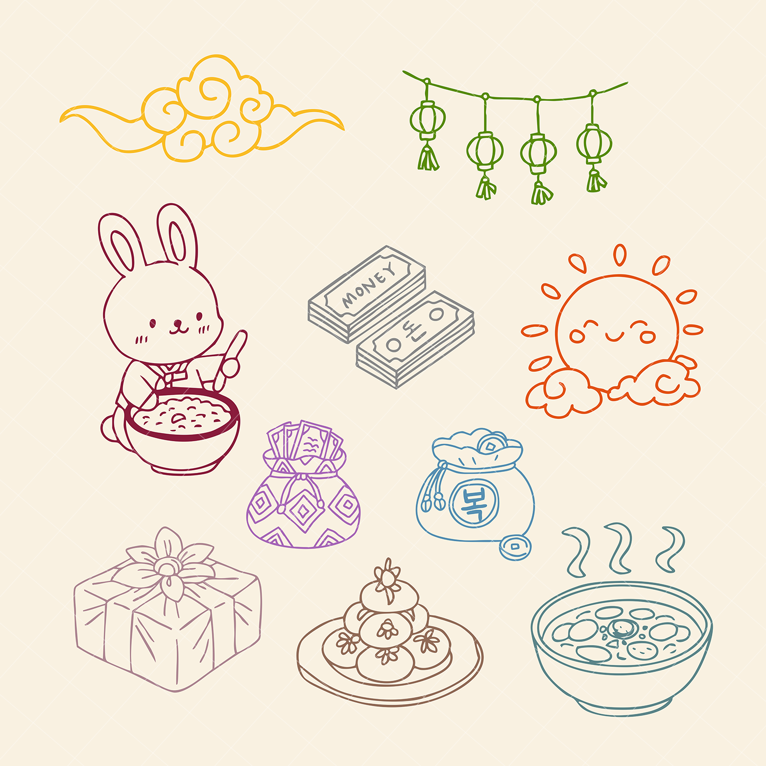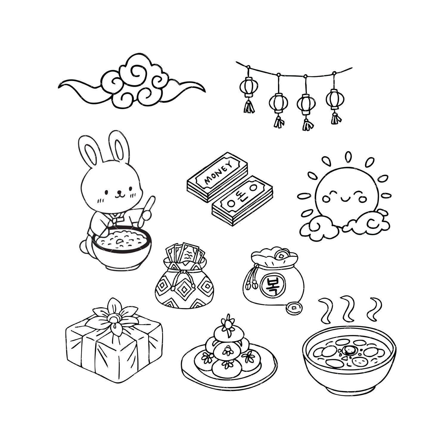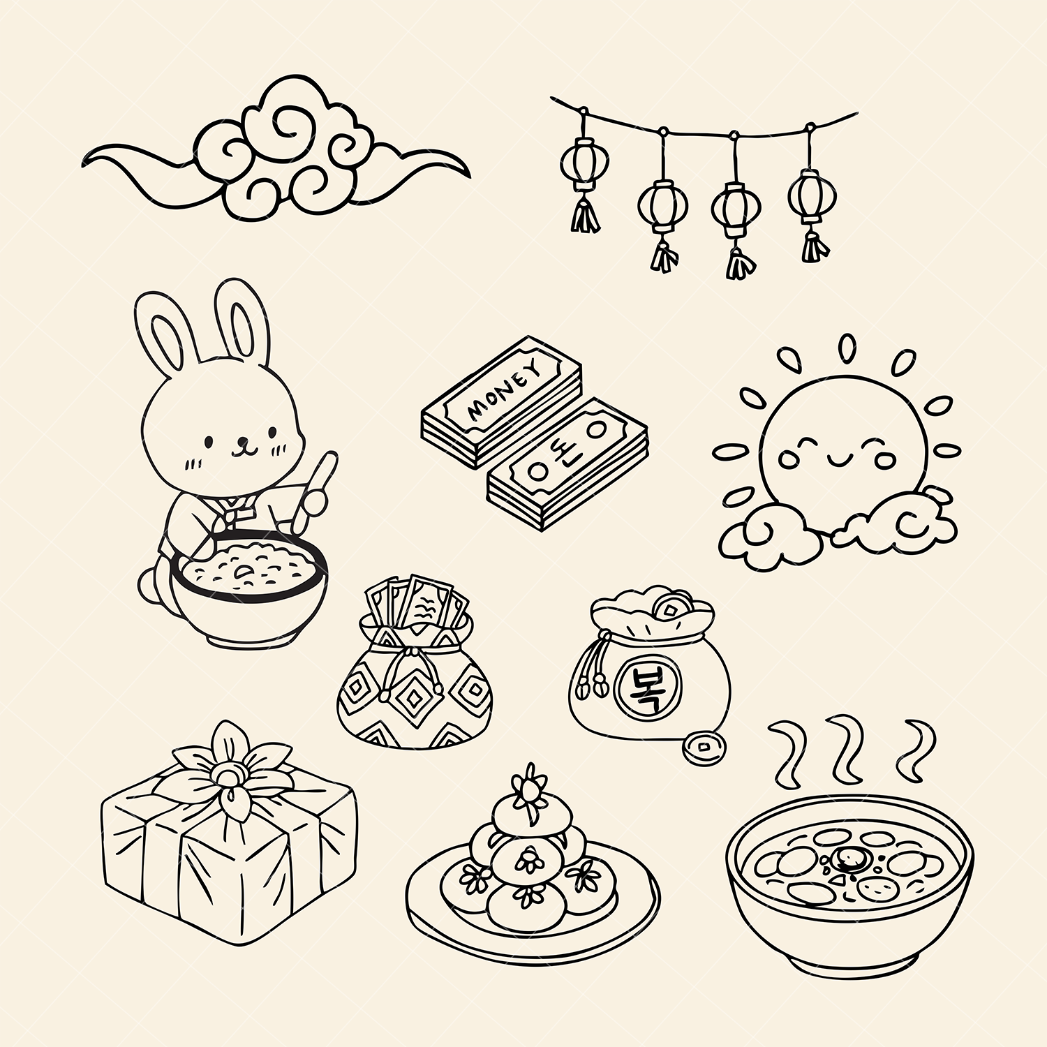 Hand-drawn Lunar New Year (Seollal) Korean Traditional Line Art Clipart Set – PNG & SVG | 17 Illustrations