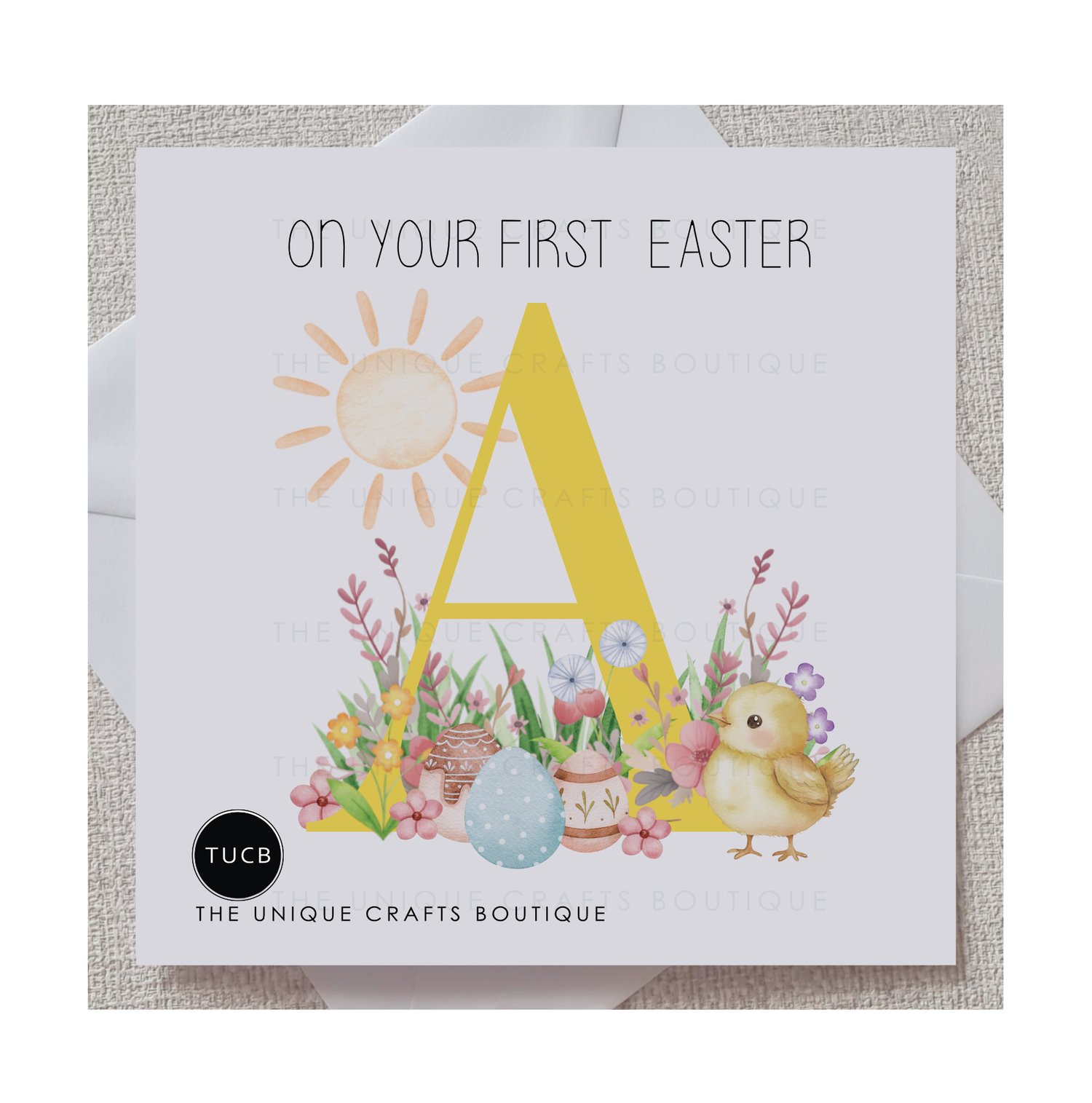 Printed with any letter of the alphabet in a bold Yellow colour surrounded by meadow and Easter eggs with a sweet little Easter chick. The message 'On Your First Easter' is displayed above in a Black playful font. This card is a certain to make your loved one smile.