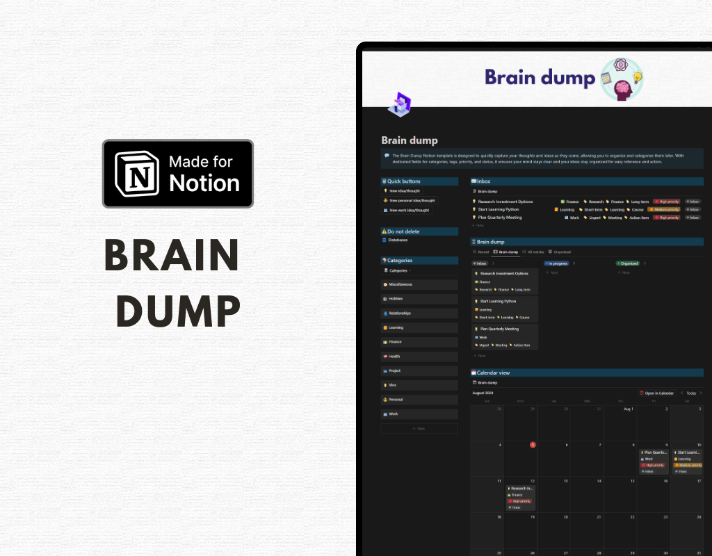 With the Brain Dump Notion template, you can maintain a clear mind while ensuring that your ideas and tasks are well-organized and ready for action whenever you are.