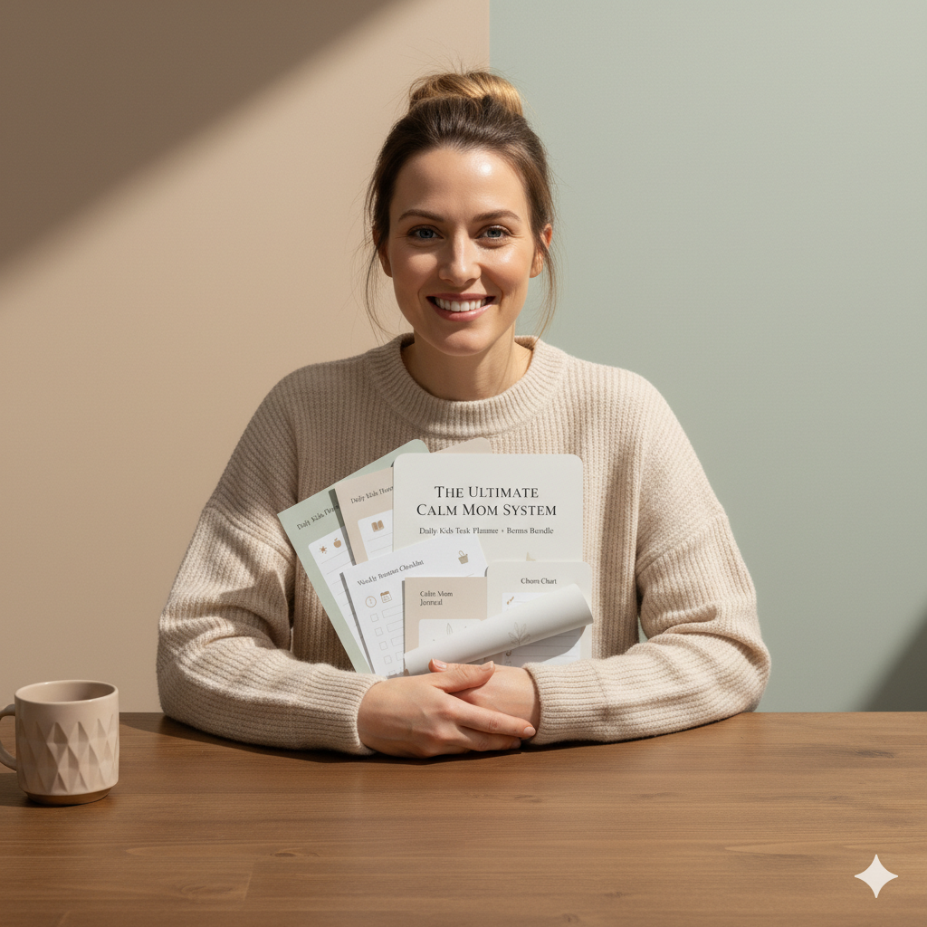 The Ultimate Calm Mom System™ is a ready-to-print planner + bonus bundle designed to help busy moms create calm routines, organized kids, and peaceful days — without burnout.