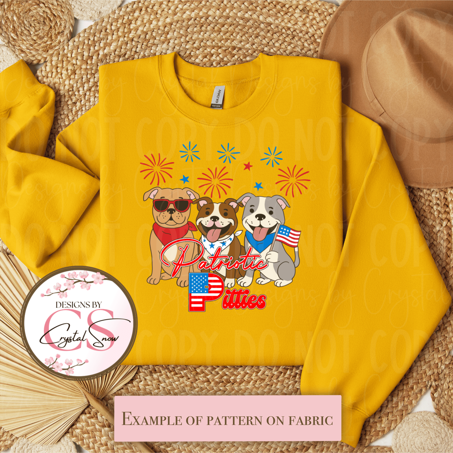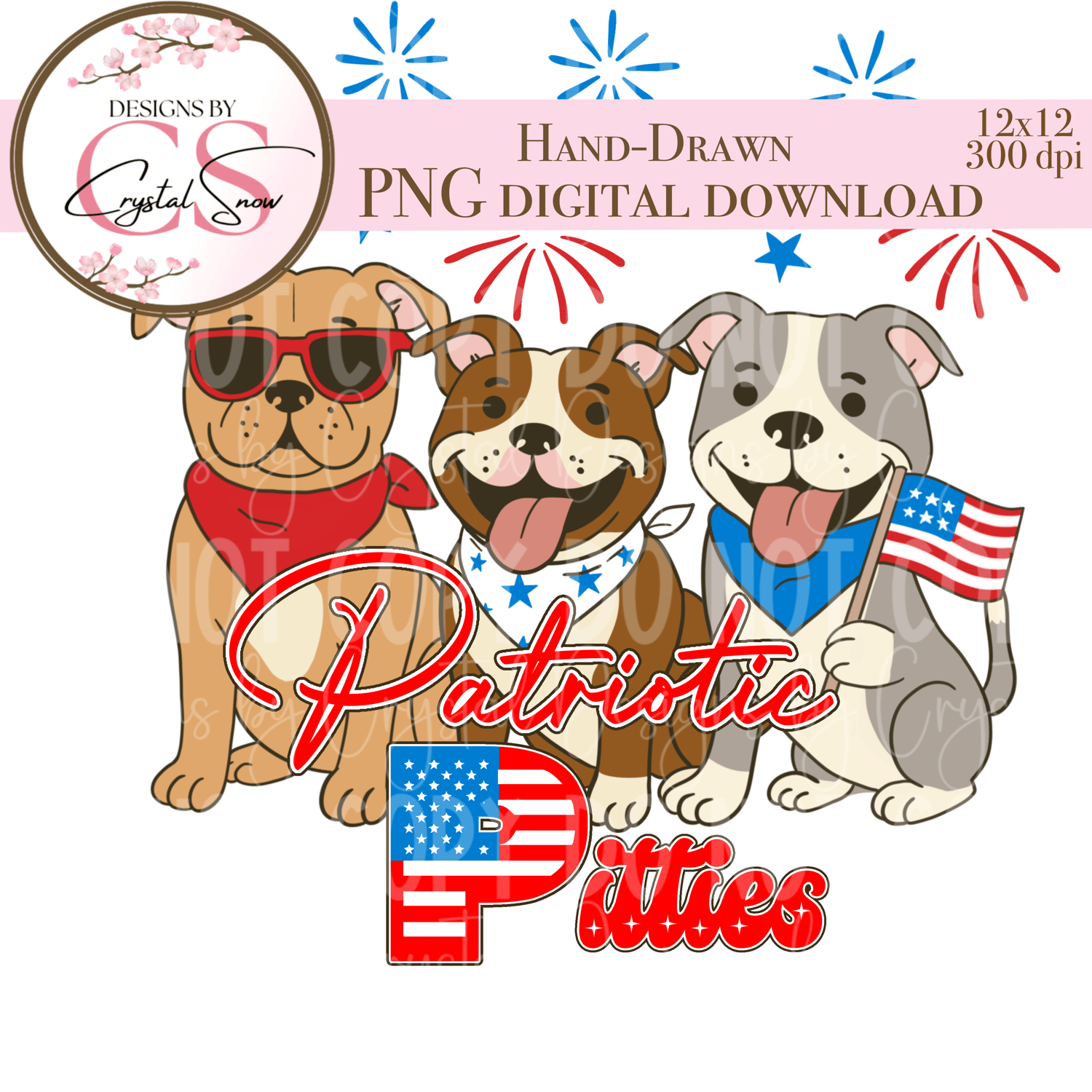 This hand-drawn digital PNG features three lovable pitbulls in red, white, and blue, decked out in patriotic gear with flags, fireworks, and big smiles. The design includes playful text reading "Patriotic Pitties" in festive lettering.