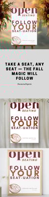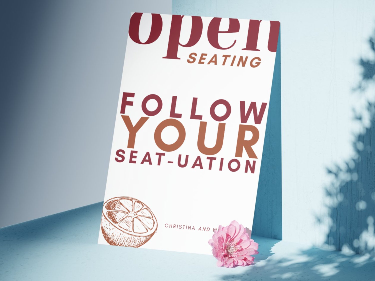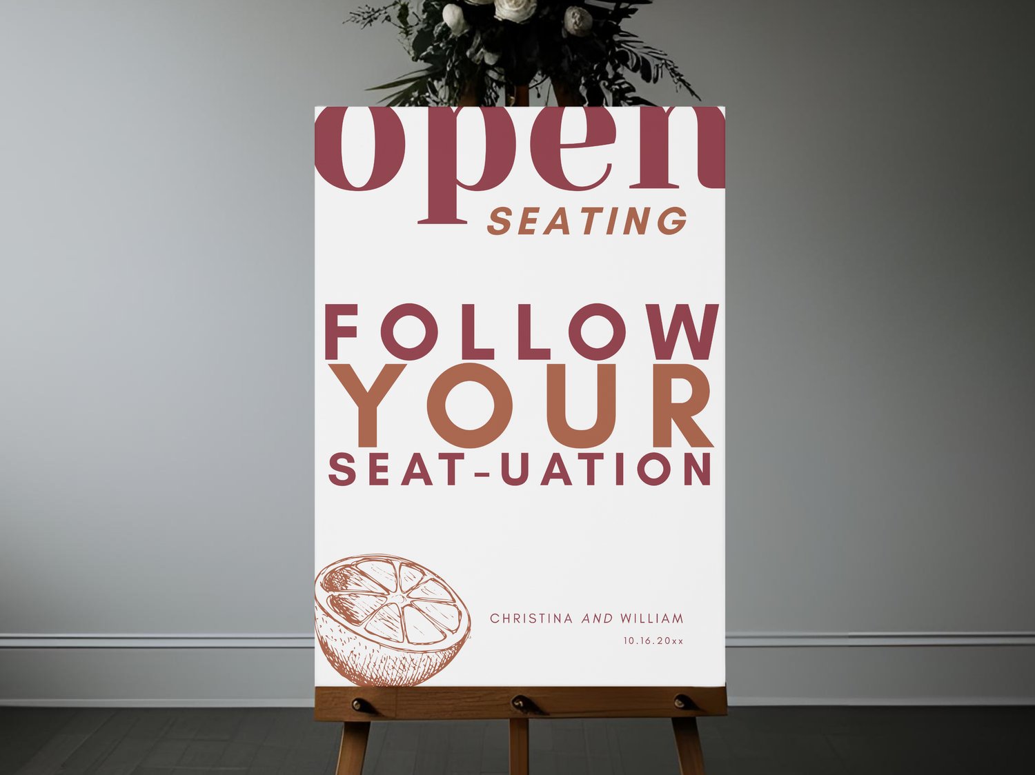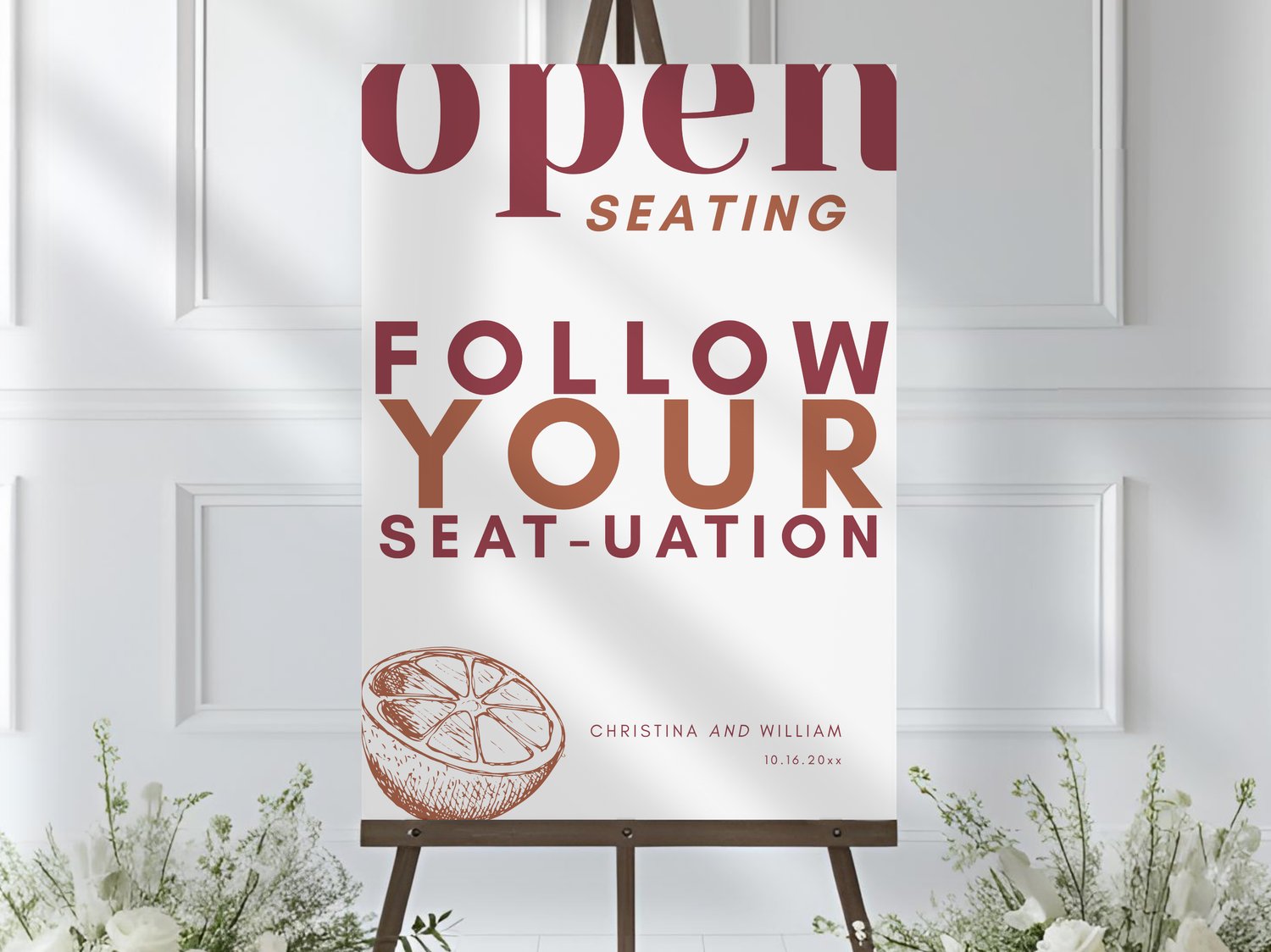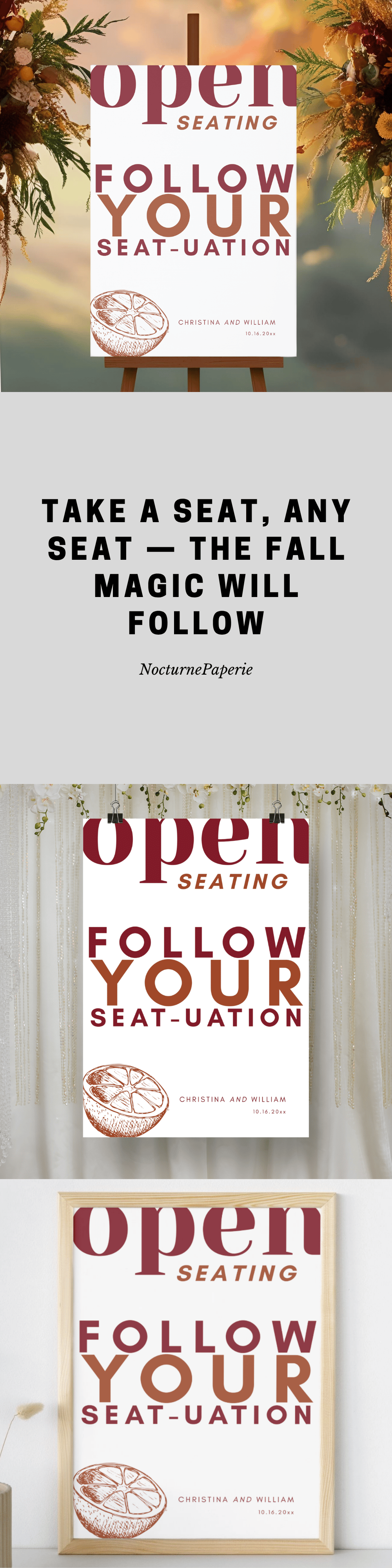 Create a relaxed atmosphere with this open seating chart template designed for a fall wedding. This editable Canva sign, featuring warm autumn tones, invites guests to sit anywhere and enjoy the celebration. It’s part of our seasonal collection on NocturnePaperie—explore other seasons like Winter, Spring, and Summer.