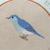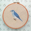 A counted cross stitch pattern of a mountain bluebird, from North America. The state bird of Idaho and Nevada.